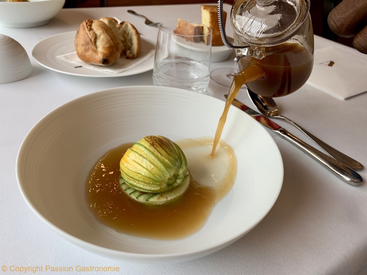 Fleurs de courgette, soufflé aux langoustines, consommé de langoustines