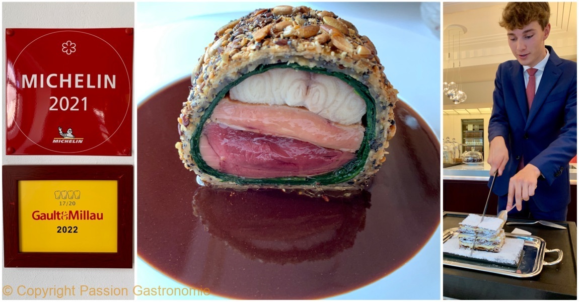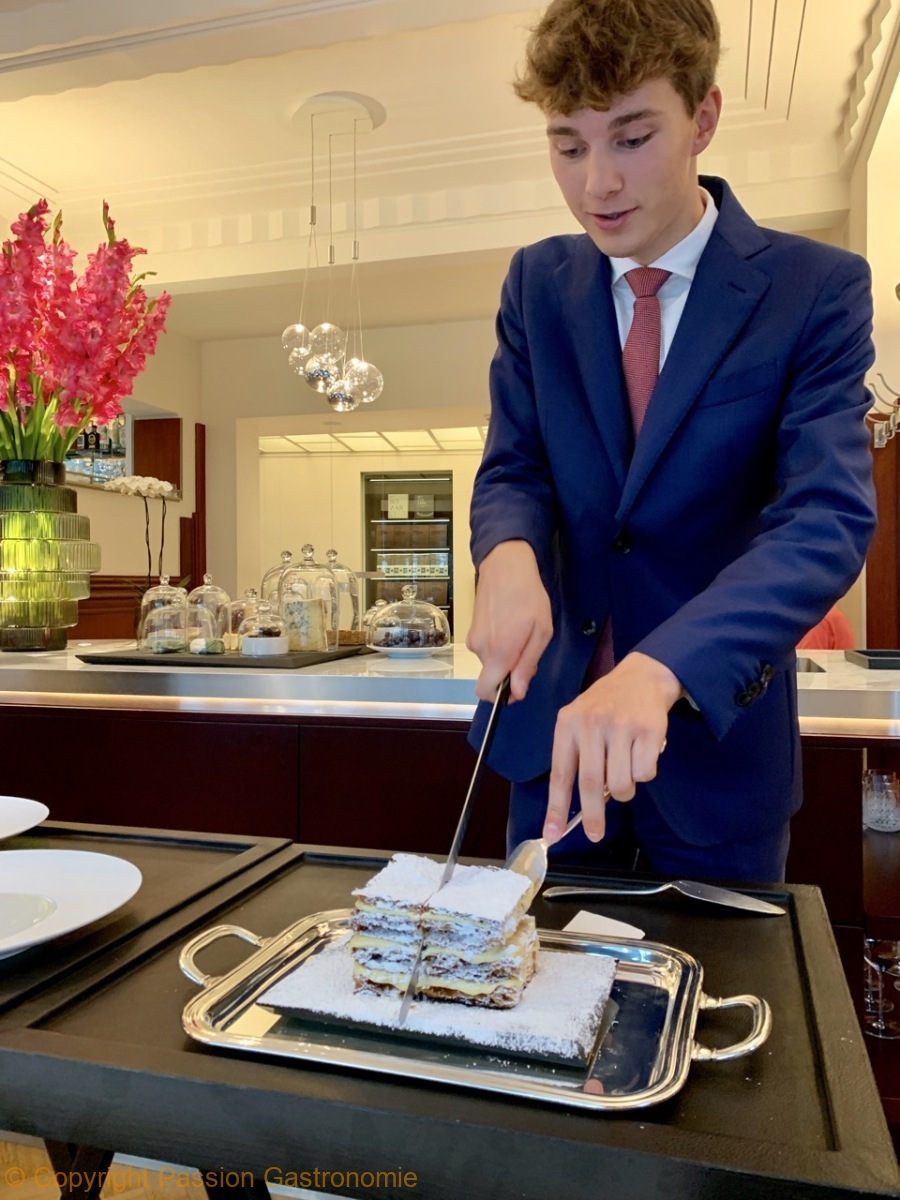 Ce dessert est sublime parce que c’est, à nouveau, un dessert pensé et étudié jusque dans les plus petits détails. Une cuisson minute, qu’on ne retrouve jamais nulle part et une découpe juste avant de servir. Le millefeuille est léger et aérien. Lorsqu’on le tranche, il ne plie pas mais il chante délicieusement.