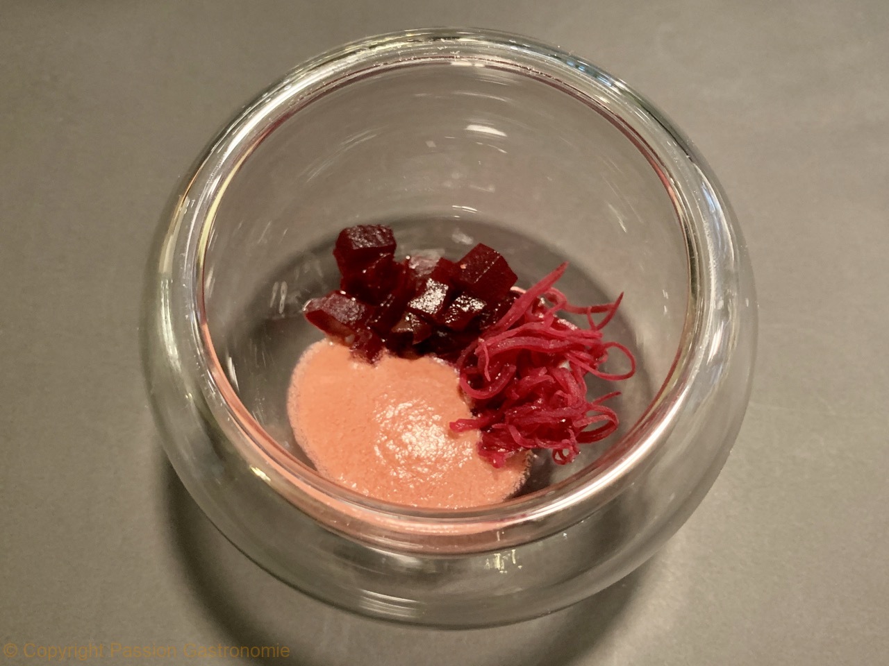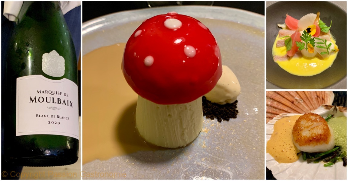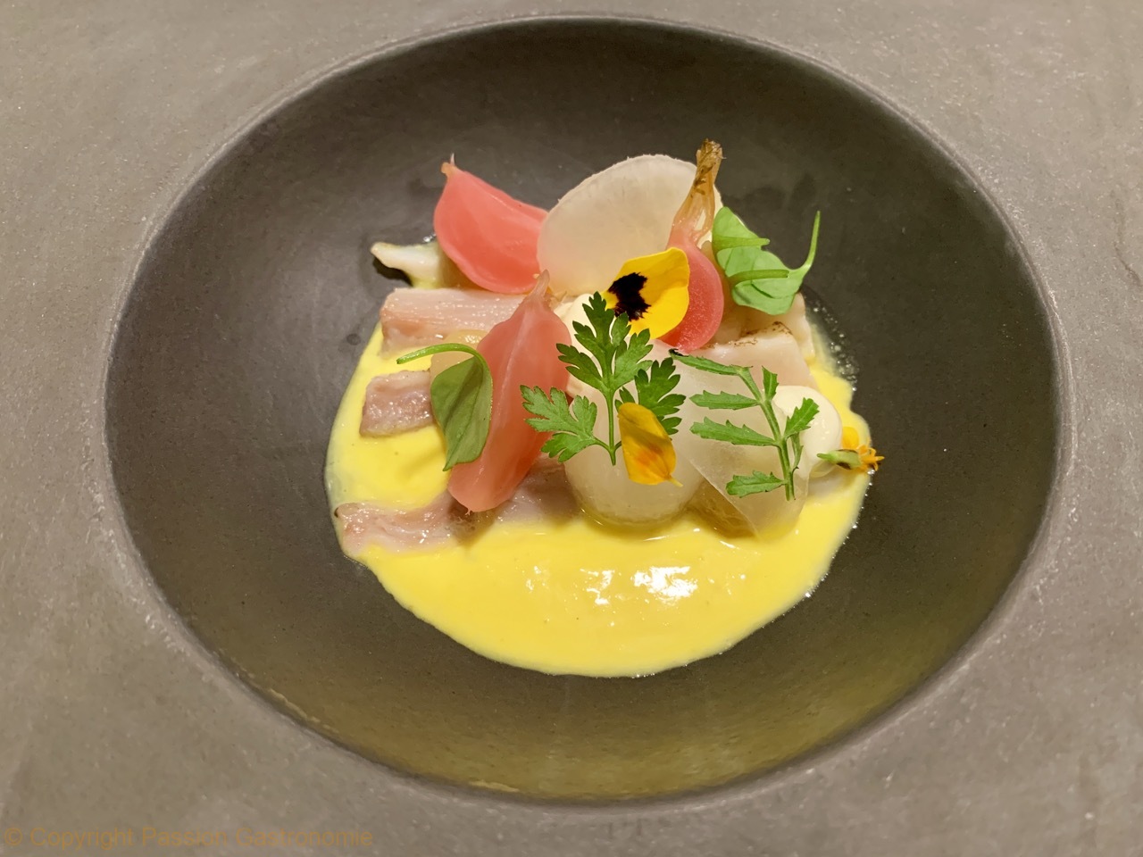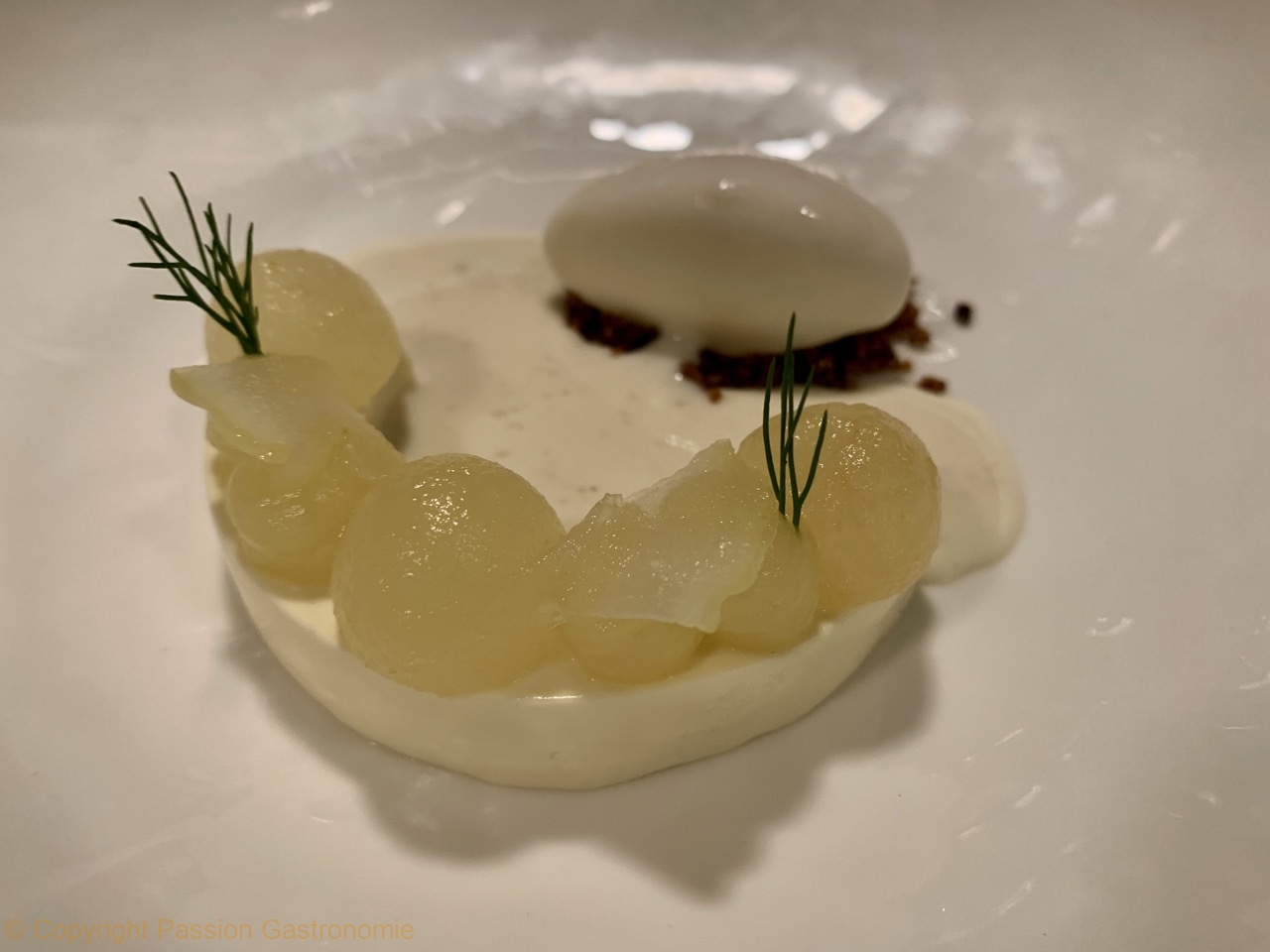 Il y aussi un vrai travail, à la Cédric Grolet (c’est dire le compliment), sur le dessert en trompe-l’œil. C’est une création très réussi aussi bien sur le plan visuel que sur le plan gustatif. Les desserts étant souvent un point faible des restaurants une étoile, la surprise est ici de taille.