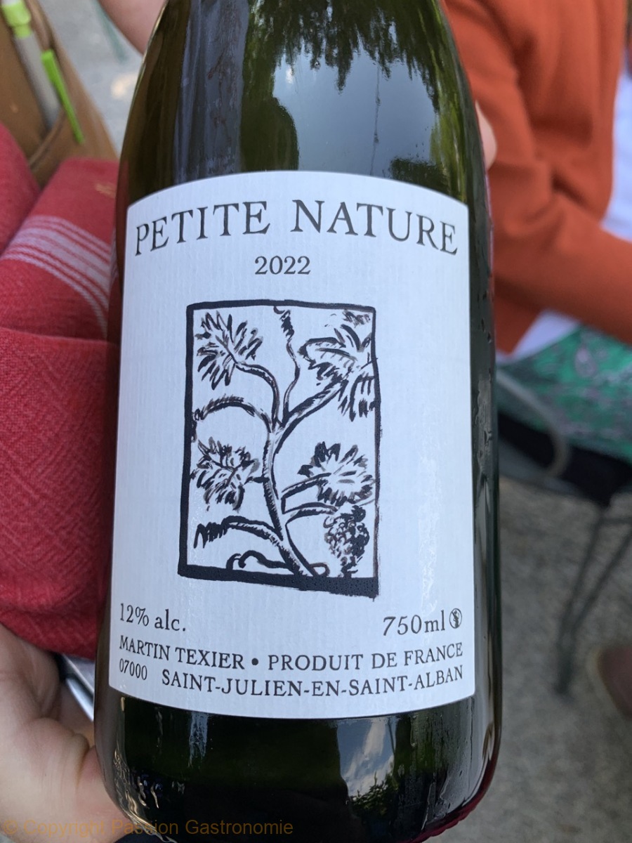 Sur le menu de six pages, il y a quelques flacons à tous les prix. On trouve notamment ce vin pétillant « local » et nature : Petite Nature 2022 de Martin Texier. Ça sent un peu l’écurie au nez (dommage) mais cela se laisse boire quand même (et on ne se plaindra pas trop pour le prix : 28 euros).