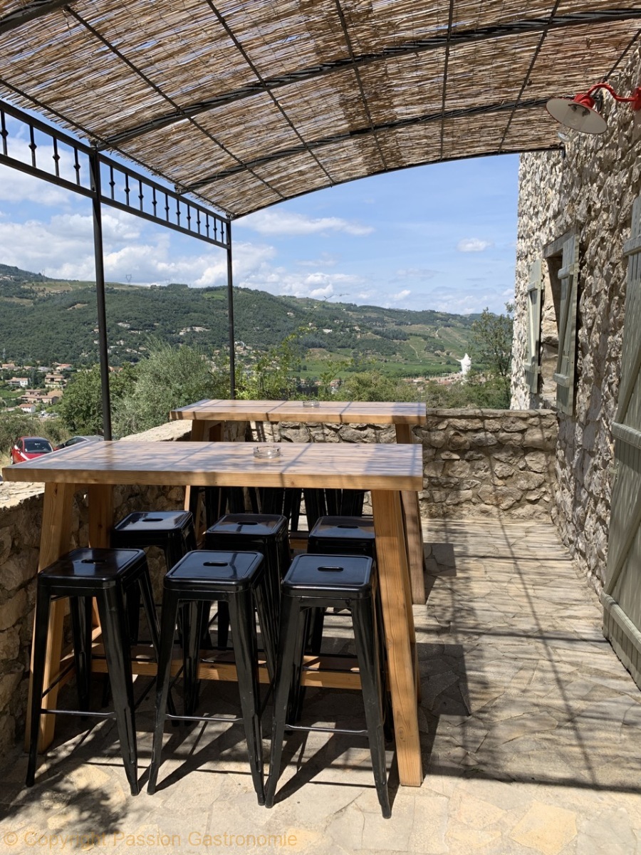 A Saint-Peray en été, il fait souvent chaud et manger en terrasse fait partie des plaisirs de vacances. A l’auberge de Crussol, on a tout d’abord une première terrasse, un peu ombragée et avec une belle vue sur Cornas et ses vignes.