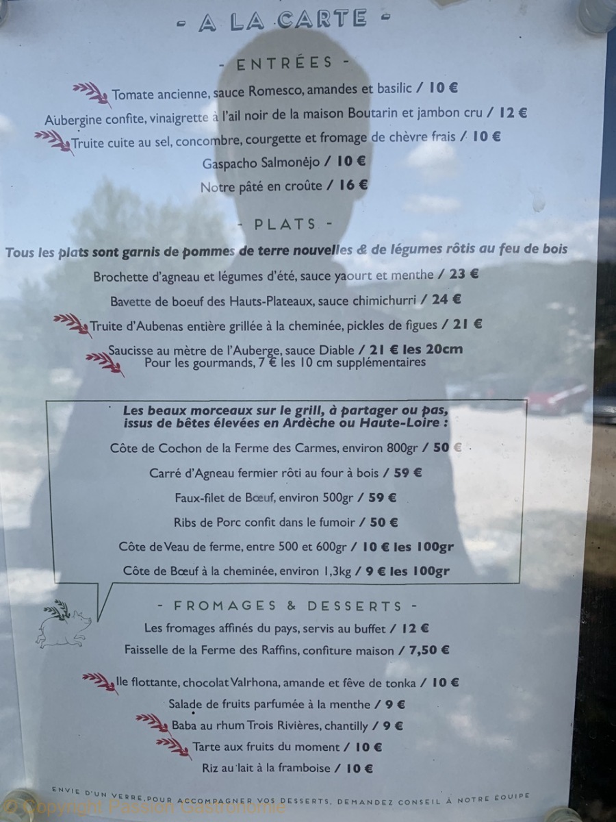 Dans la carte de l’auberge de Crussol, on retrouve un menu trois services à 34,9 euros et quelques plats à la carte :