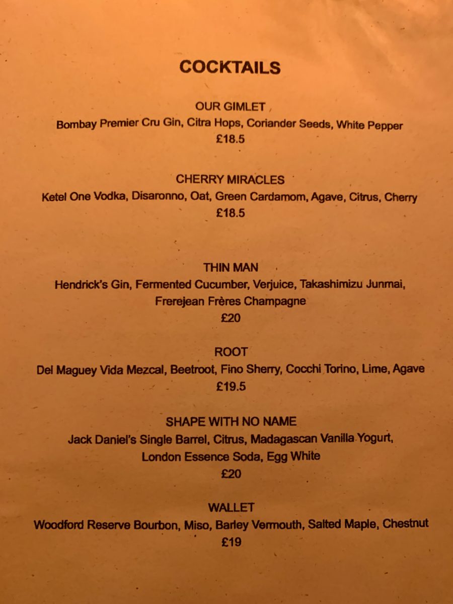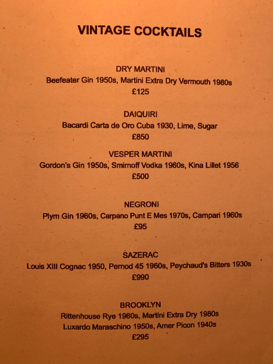 Le choix des cocktails créations est très large : une trentaine au total. Les prix tournent autour de 19 à 20 livres sterling.