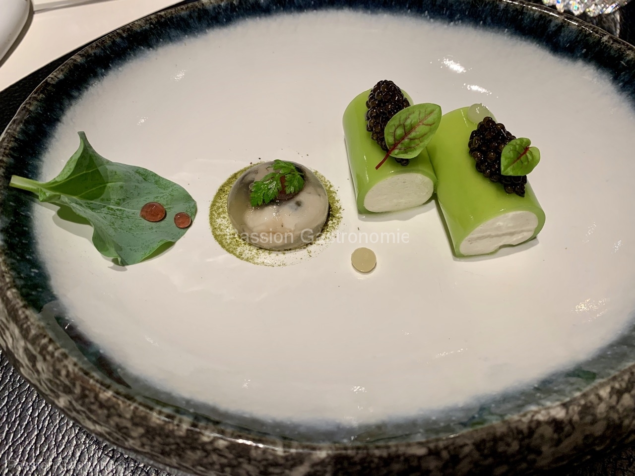 L'huitre de Bretagne perlée, pomme, concombre, citron, caviar, thé match @Restaurant La Plage d'Amée
