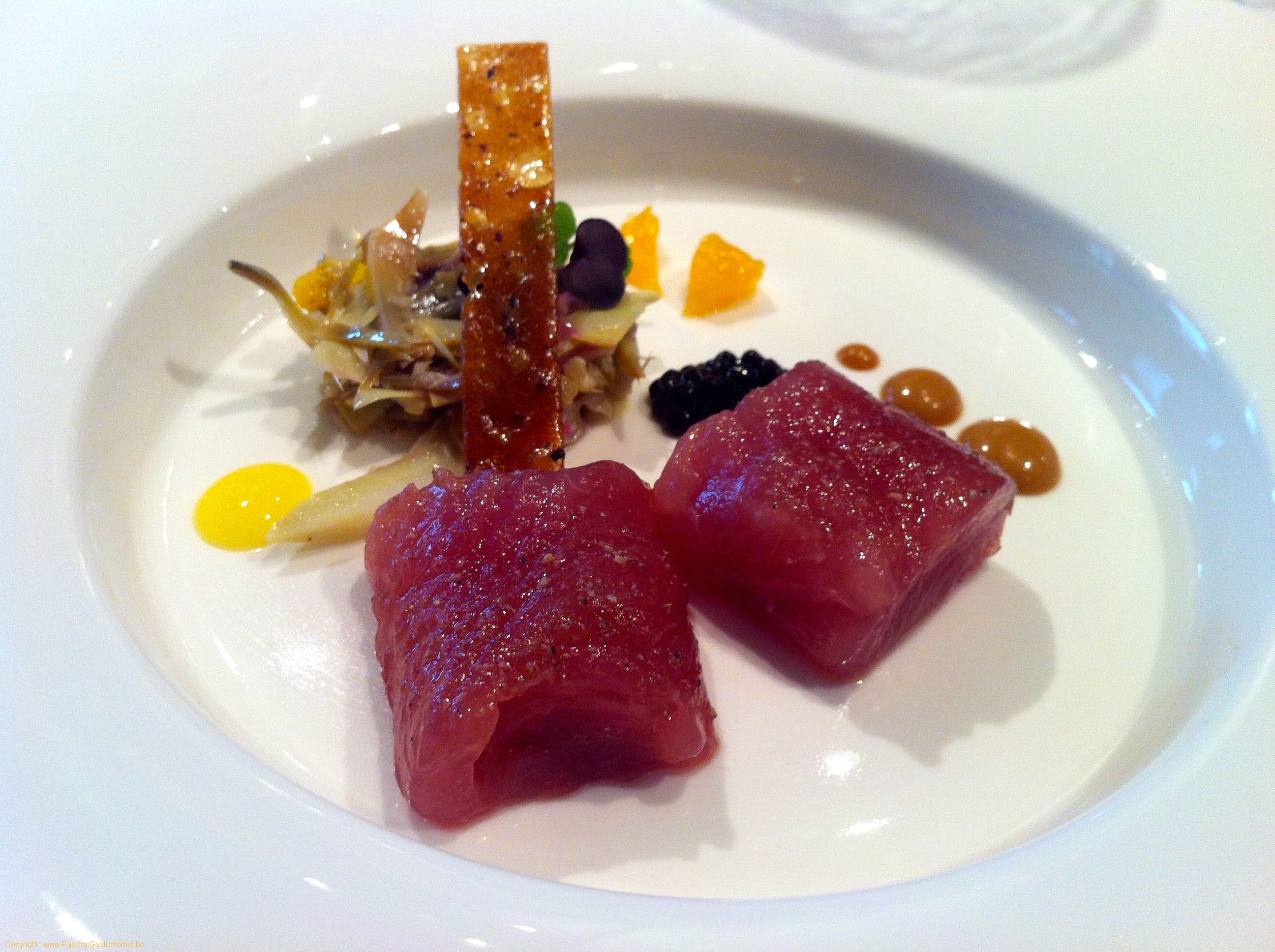Entrée : Sashimi de bonite, salade croquante d’artichaut, croustillant à base de caramel et poivre de Sichuan, agrumes, coulis à base d’oursin @Jaloa Gastronomique