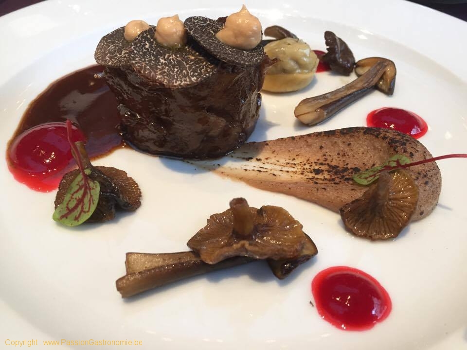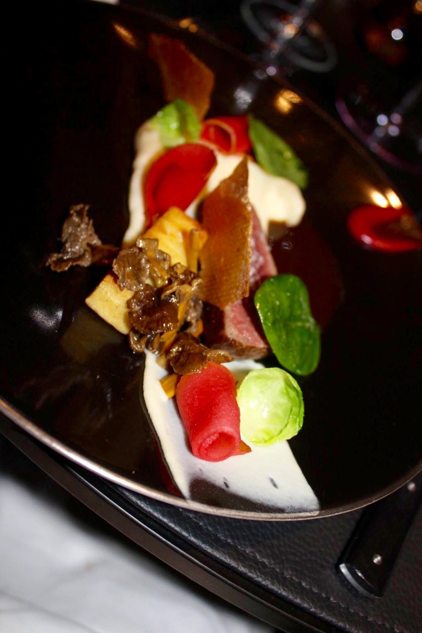 Plat : Filet pur de Black Angus, girolles poêlées, pommes de terre de Noirmoitier, crémeux de carottes des sables dans un oignons brûlés, textures de parmesan, gel d’airelles, jus de viande @Alexandre