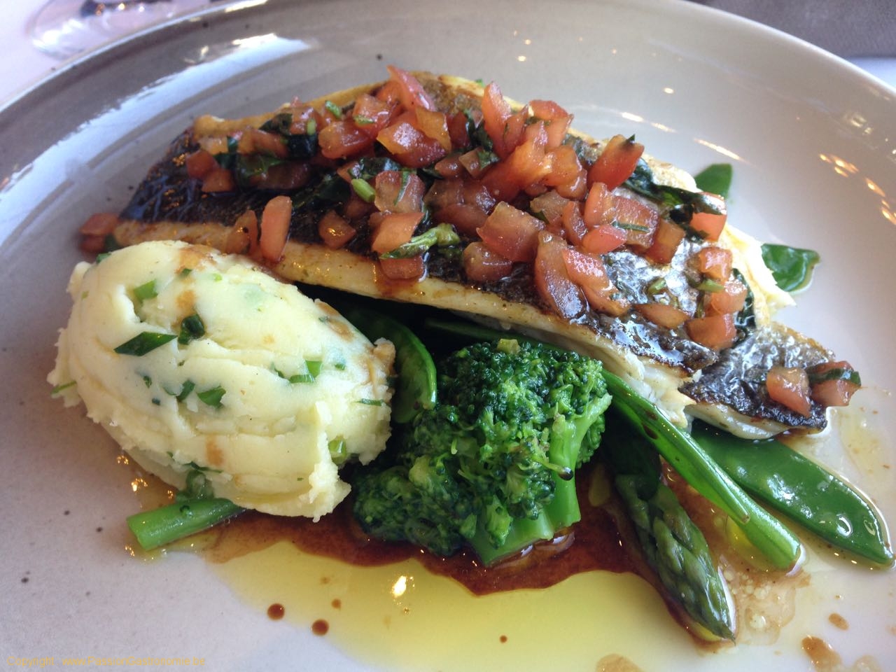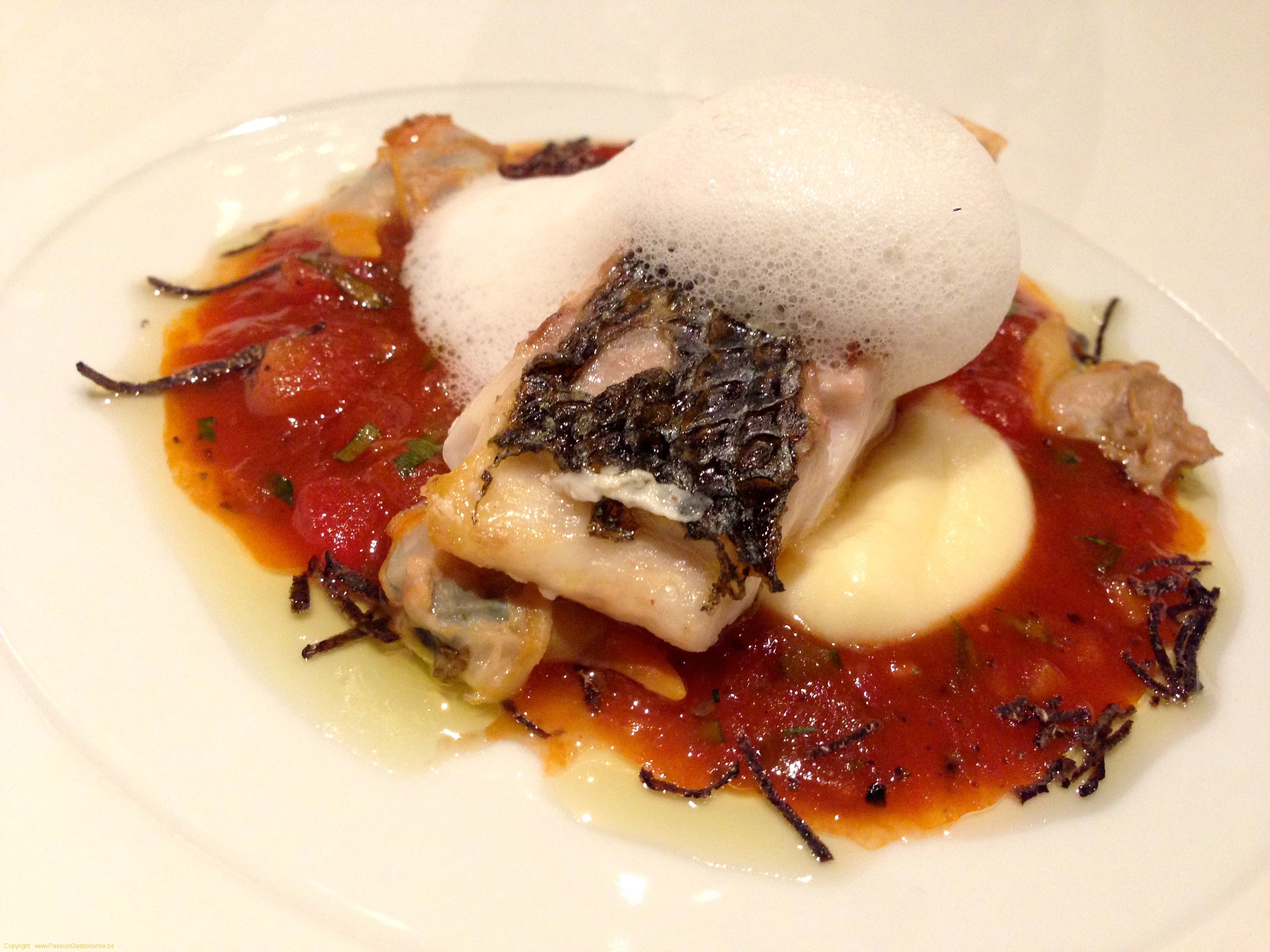 Filet de bar de ligne rôti sur peau à la plancha, pommes de terre, coques, concassée de tomates @L'Eau Vive