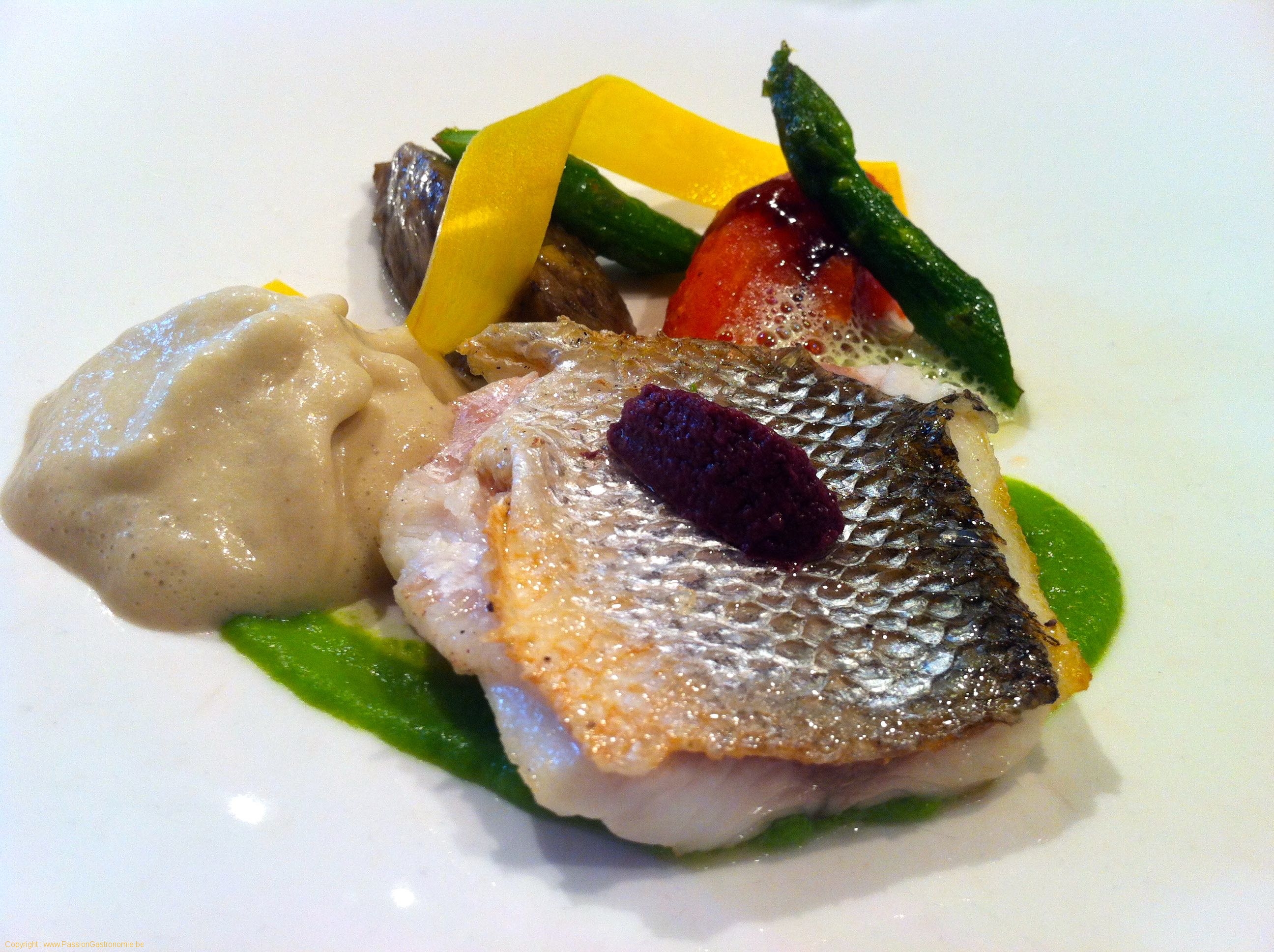 Bar de ligne, mousse de petit pois et citronnelle, caviar d’aubergine, carotte jaunes, émulsion d’asperges vertes, pointes d’asperges et tomates cœur de bœuf @Jaloa Gastronomique