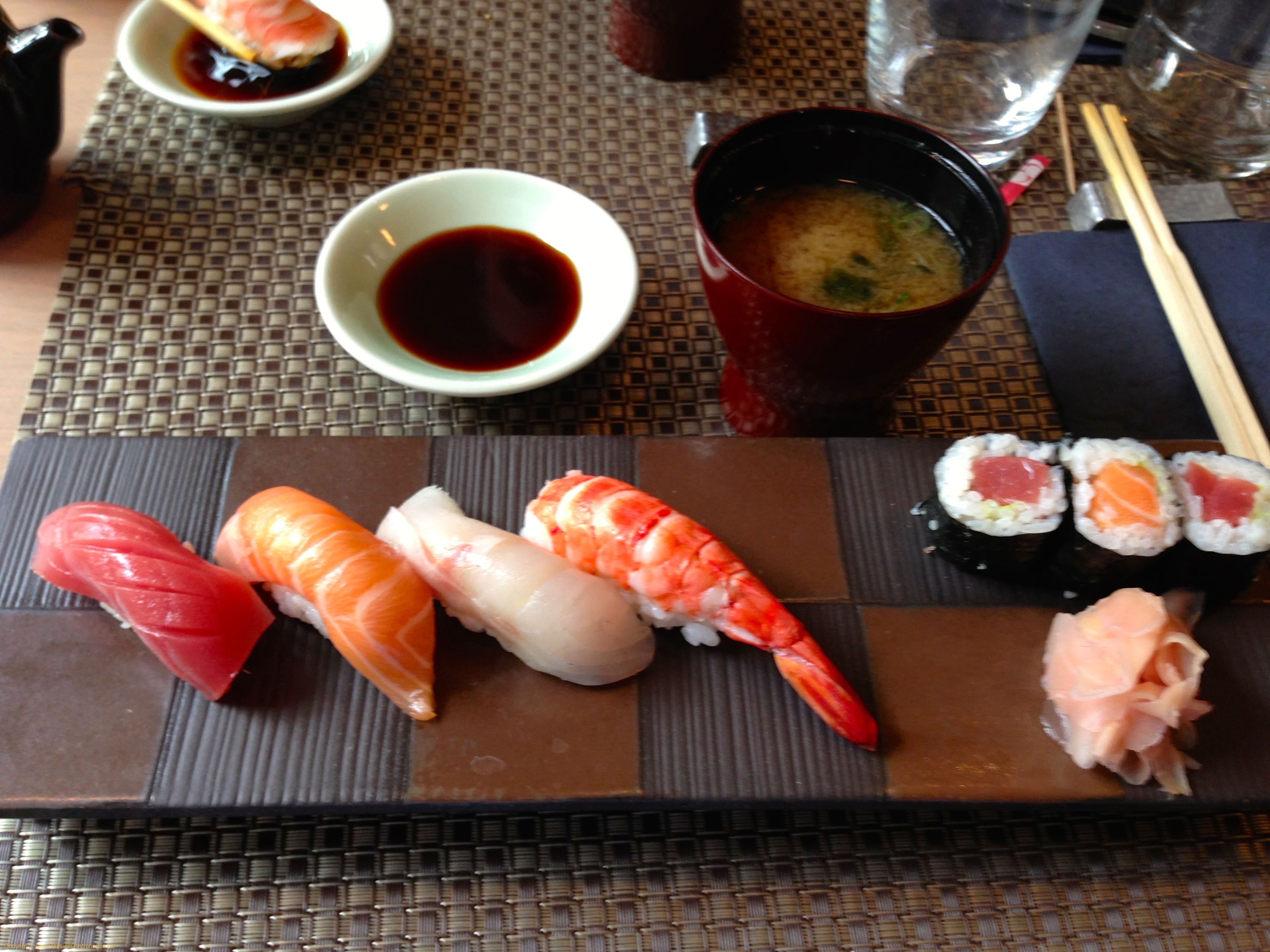 Sushi (thon, saumon, bar, scampi), maki (thon et saumon) et soupe miso @Kamo