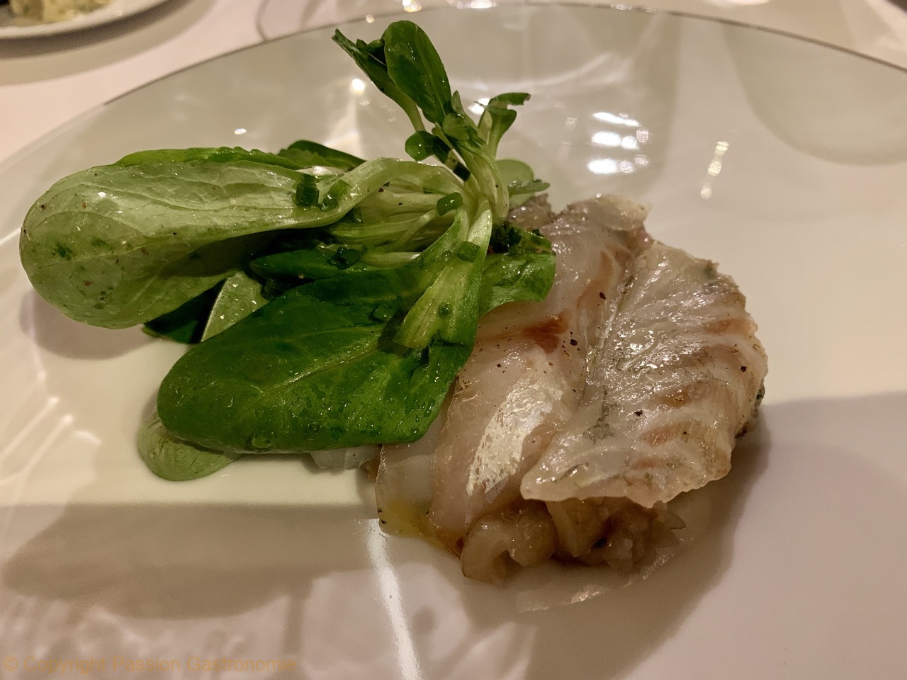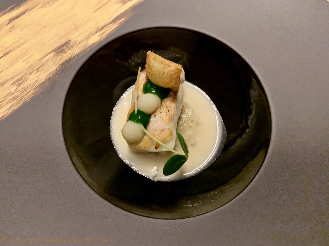 Bar de ligne, embeurrée de choux chinois au pied porc, texture de betterave blanche, pomme soufflée et crémeux au Champagne @Restaurant L'Essentiel