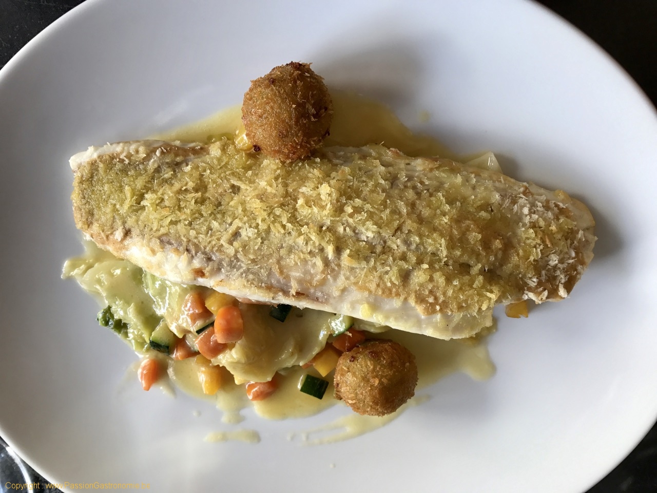 Bar de ligne, tourteau, arachides, primeurs et herbes, jus de curry et café. Une déclinaison de plats d’inspiration Indonésienne avec notamment l’utilisation de café et de Bumbu bali (mélange d’épices). @Restaurant Oud Sluis