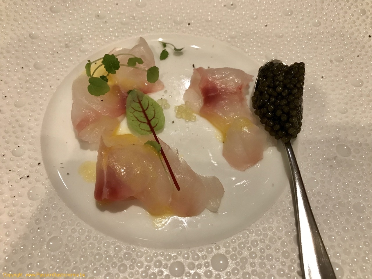 Calque de bar coupé au couteau, jus d'agrumes, citron caviar Caviar Royal Select de la Villa Lorraine @Restaurant Le Grill aux herbes d'Evan