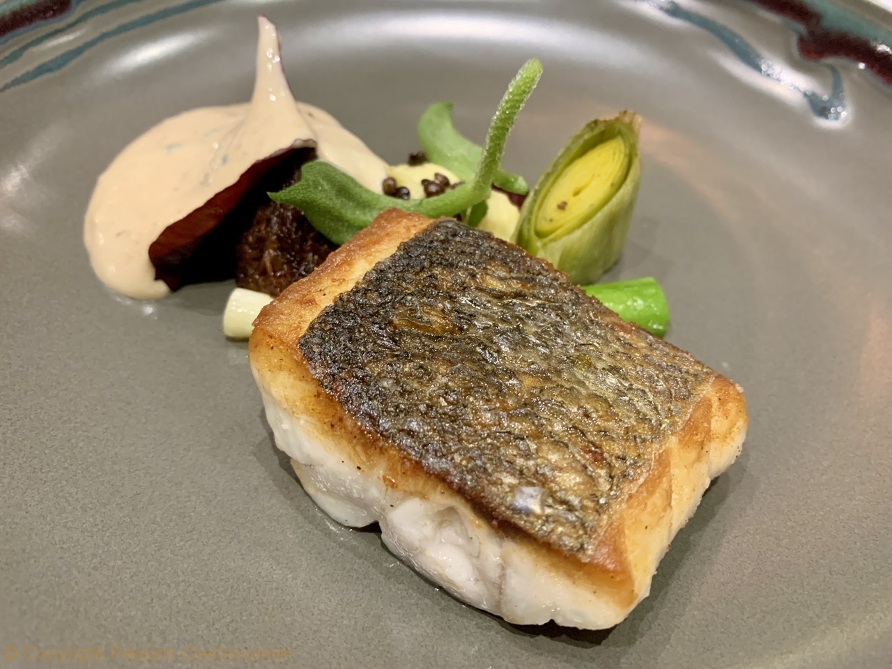 Dos de bar de ligne rôti sur peau, joue de boeuf, poireau, lentilles frites , émulation de vin rouge et échalotes @Restaurant Le Prieuré Saint-Géry