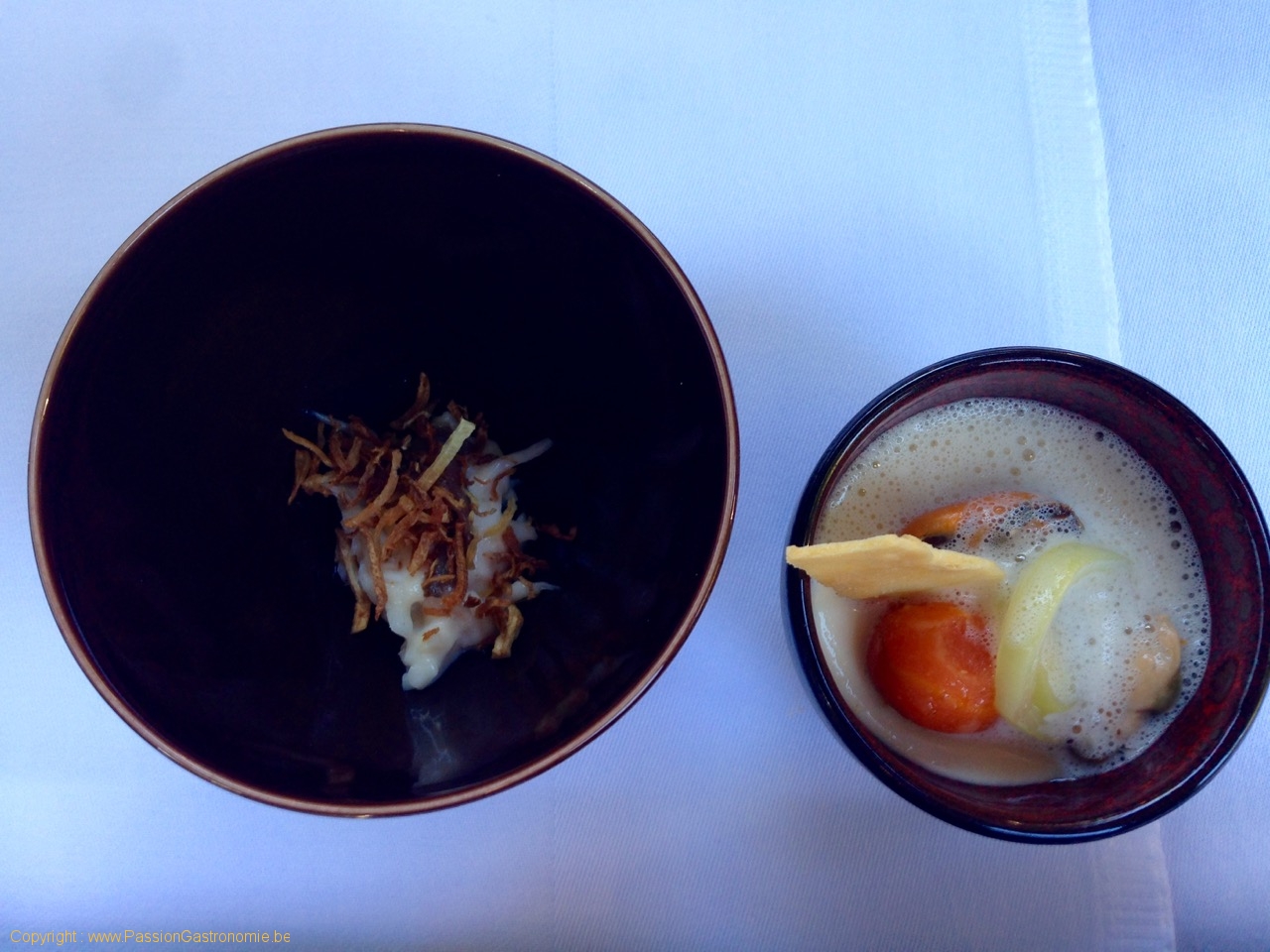 1) Royale d'anguille fumée, yuzu 2) Anchois mariné, rémoulade, céleri-rave @Le Prieuré Saint-Géry