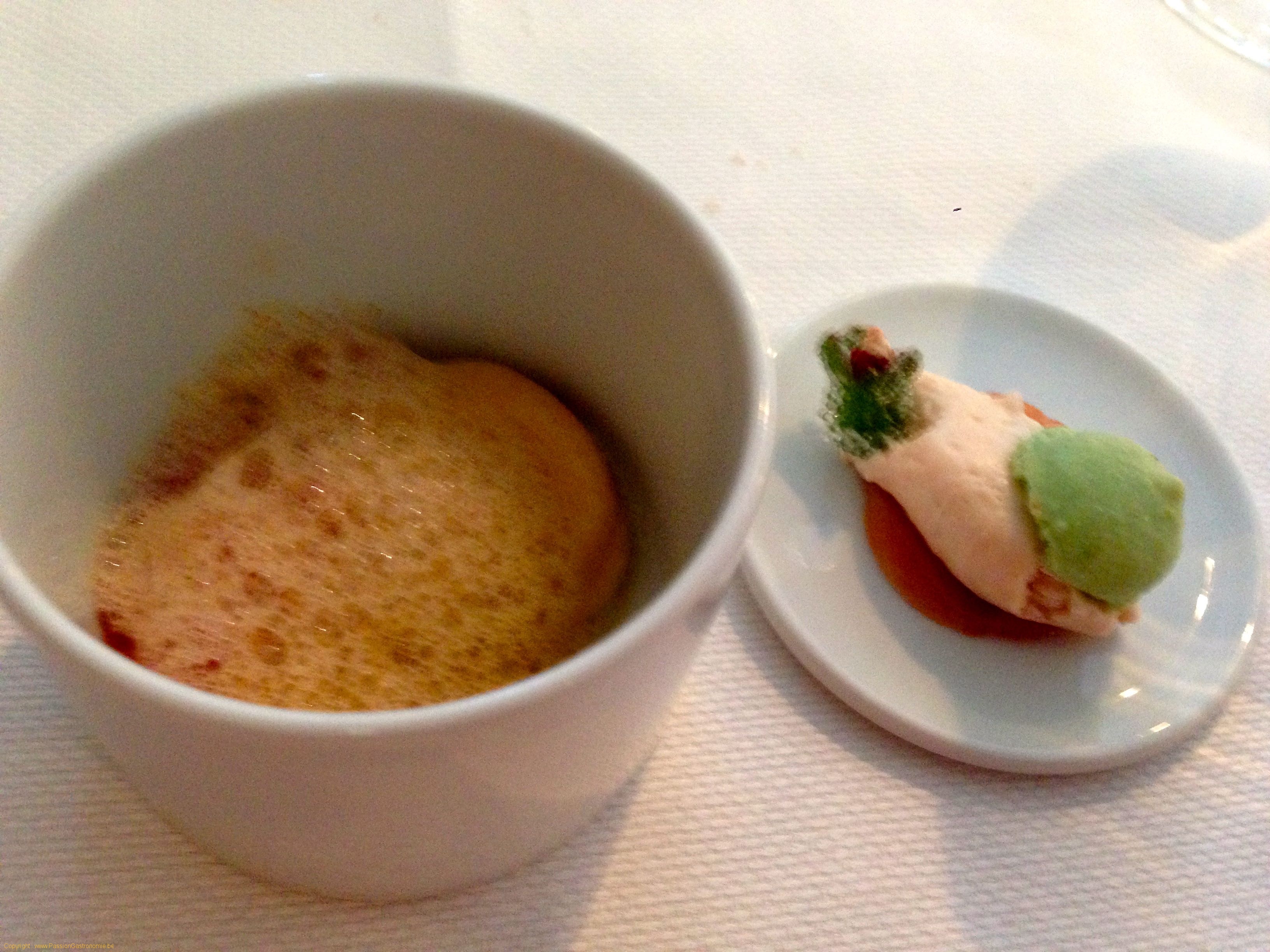 Mise en bouche : Saumon, mousse de saumon, ravioli et bisque de crevettes @Terborght