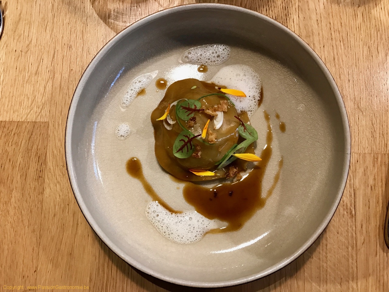 Raviole de foie gras de canard landais laqué au bouillon parfumé au ponzu, émulsion citronnée @Colonel
