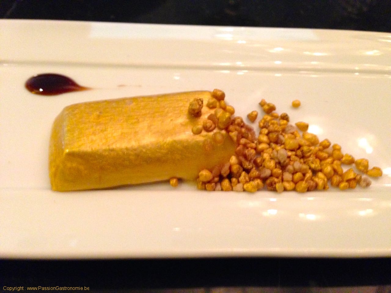 Mise en bouche : Lingot d’or de foie gras, amandes, sirop d’érables @Arabelle