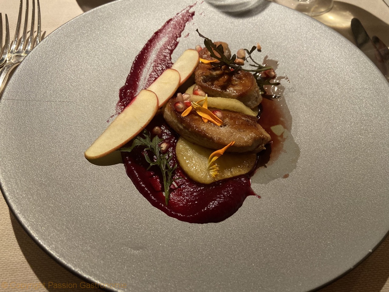 Foie gras de canard poêlé, pink lady, paksoy @Restaurant Michel
