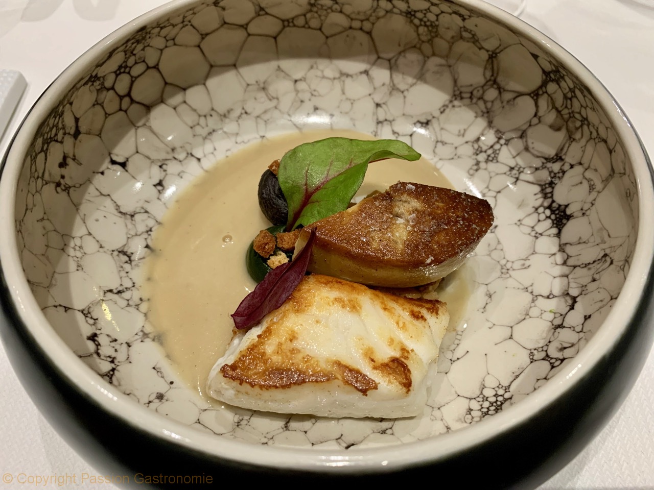 Turbot simplement snacké, foie gras poêlé, texture de trompettes de la mort, velouté de volaille parfumé à la truffe @Restaurant Le Prieuré Saint-Géry