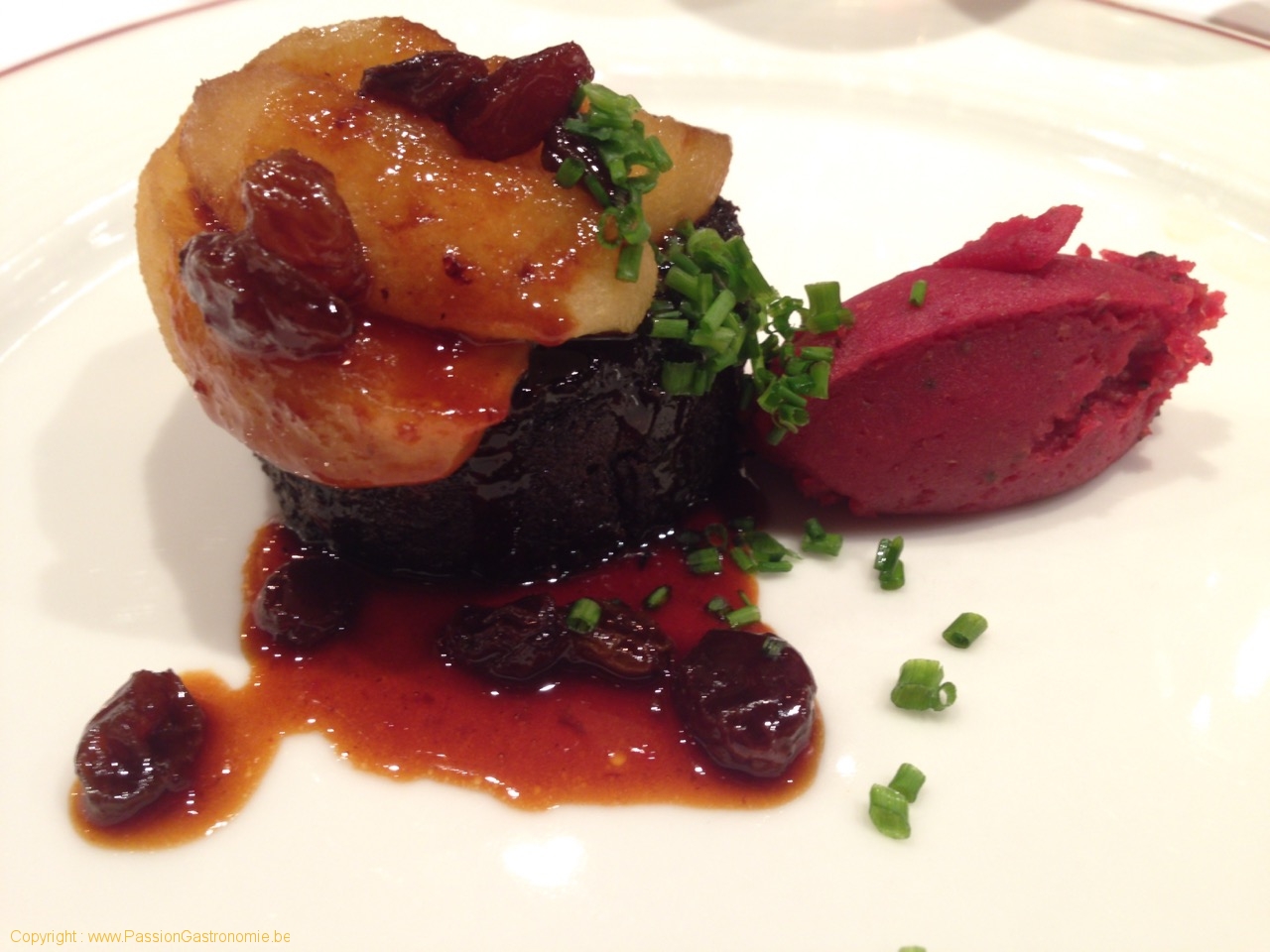 Mon Boudin noir au Foie gras d’Oie, soigneusement préparé à la Maison, rôti aux Pommes caramélisées, Sauce au Jus de Travers et Couenne fumée @Le Fou est Belge