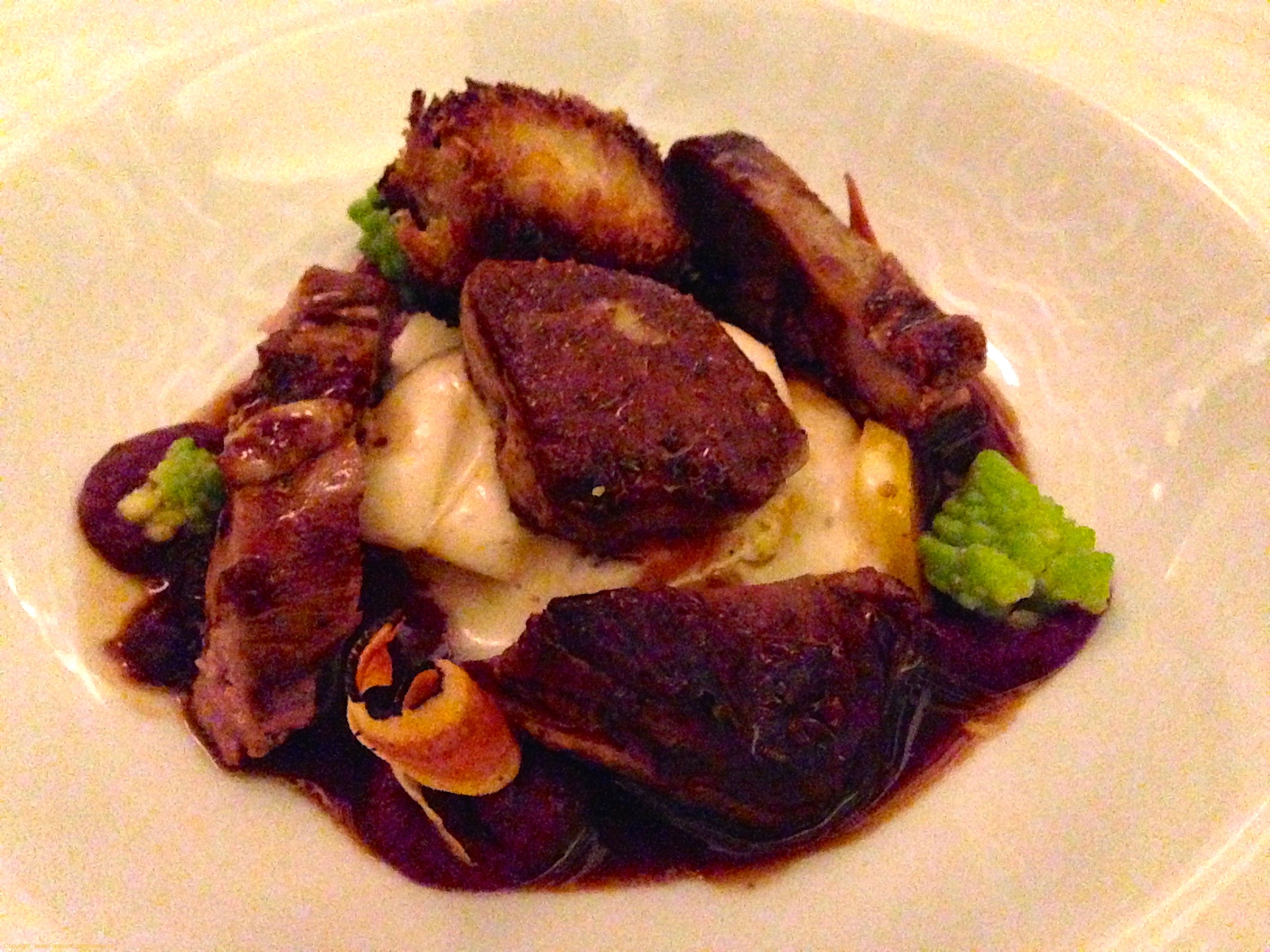 Escalope de foie de canard, charpie de coq au vin, lard en cuisson lente, oignon, gratin de macaroni @Le Prieuré Saint-Gery