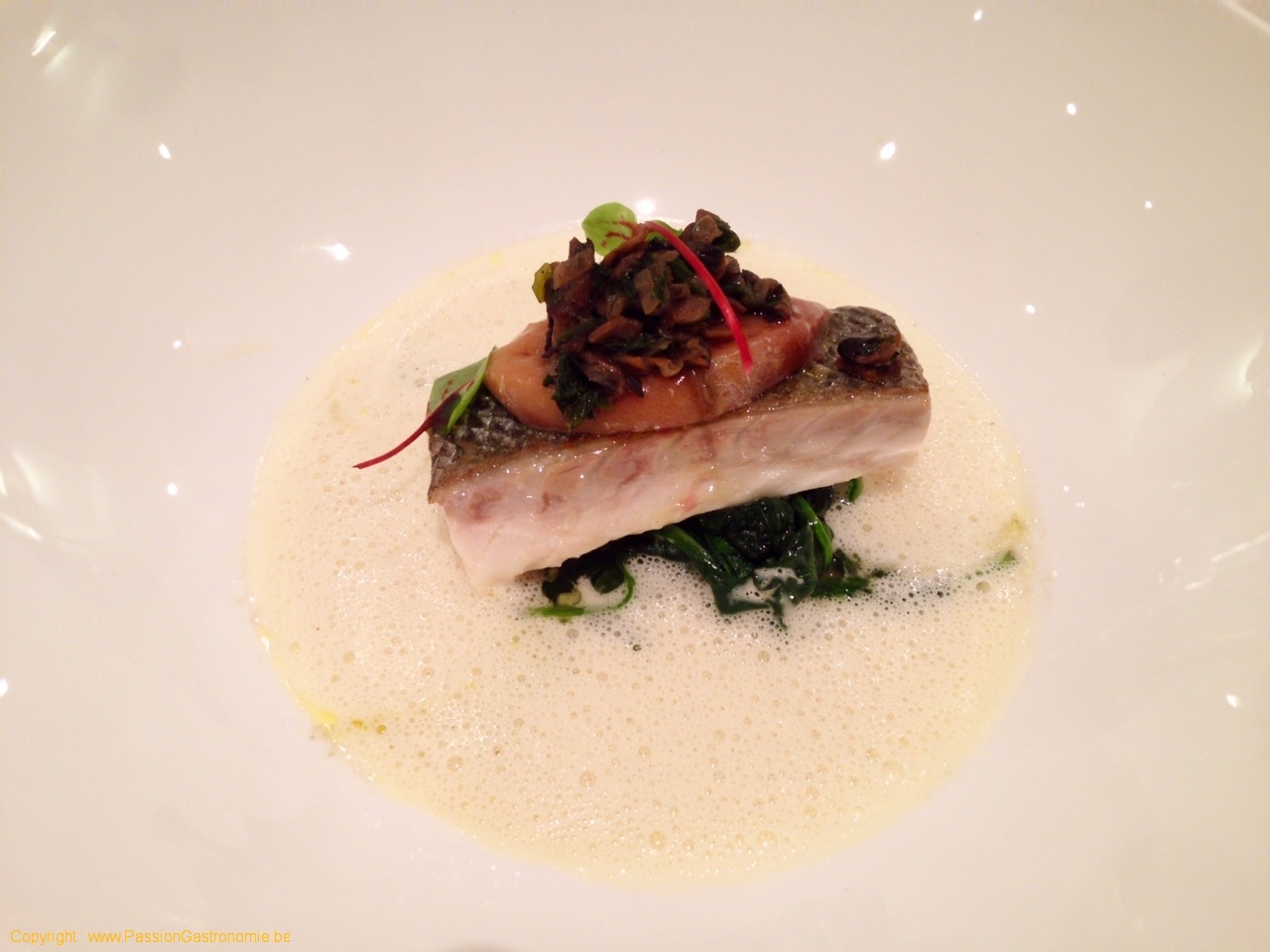 Bar sur peau, foie gras, épinard @Le délice du jour