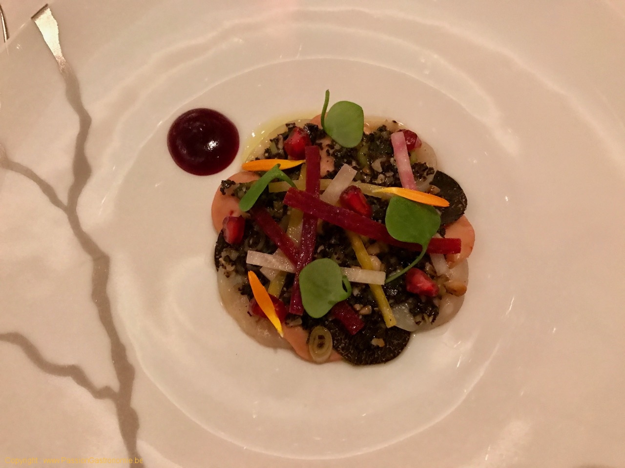 Carpaccio de Saint-Jacques et foie gras, truffes noires, betteraves et grenades en salade @La Villa Lorraine