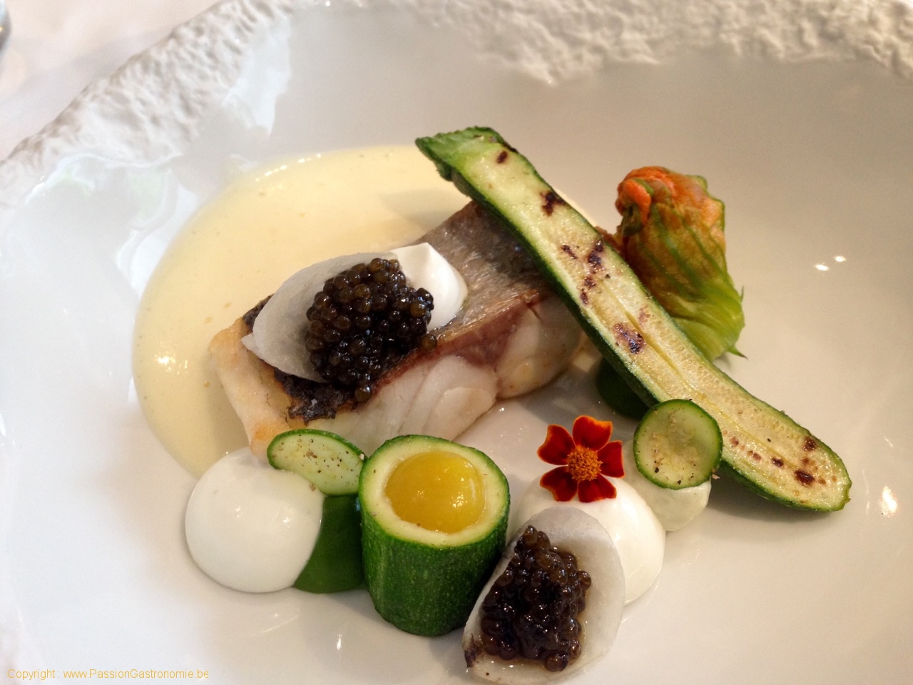 Seconde assiette de bar sauvage et caviar « Toison d’Or » : poêlé, fleur de courgette, couteaux de mer, livèche et brocolis @Château du Mylord