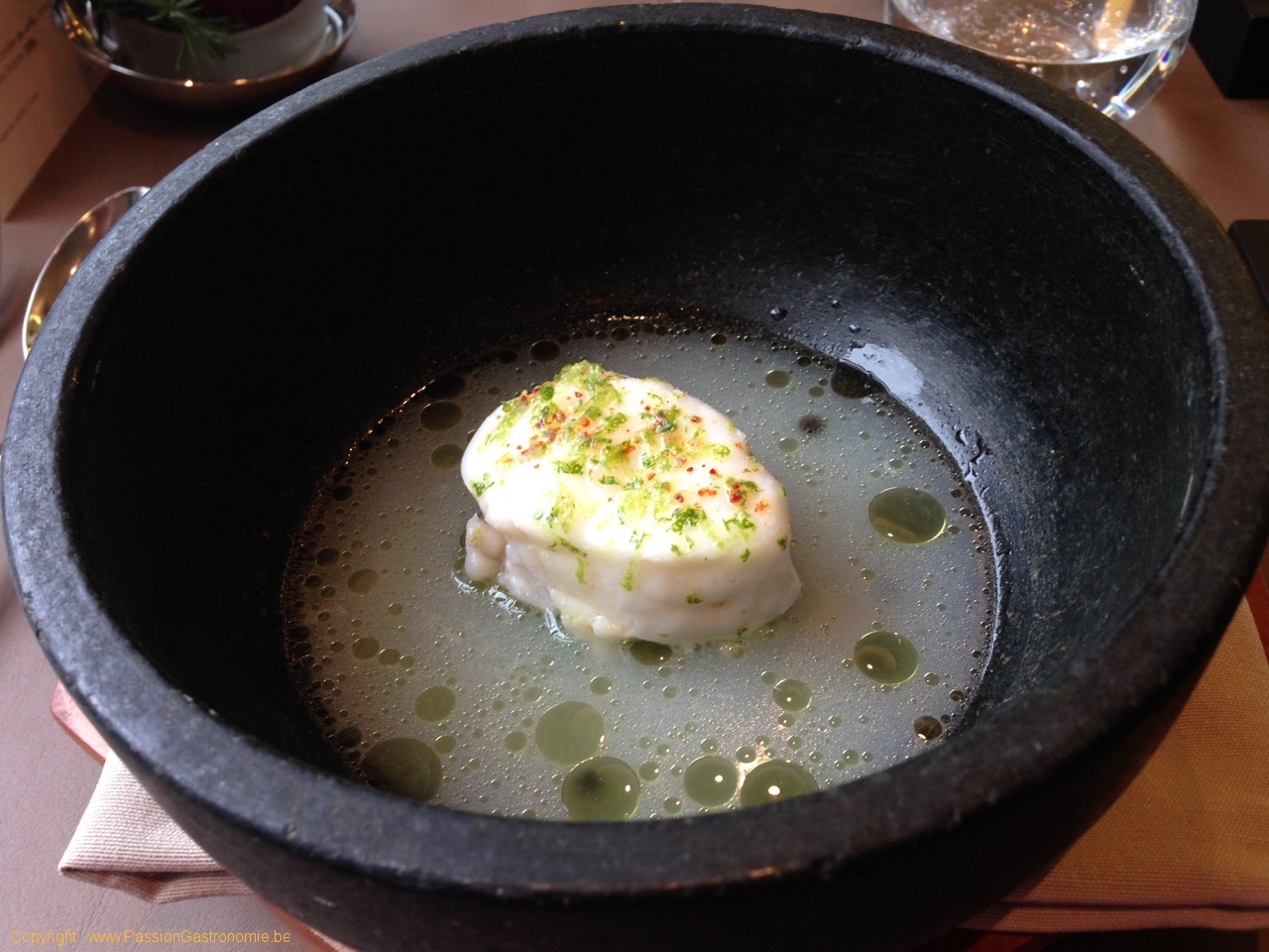 Lotte pochée, citron vert, livèche & coriandre, bouillon clair à la noix de coco & huile de combava @SaQuaNa
