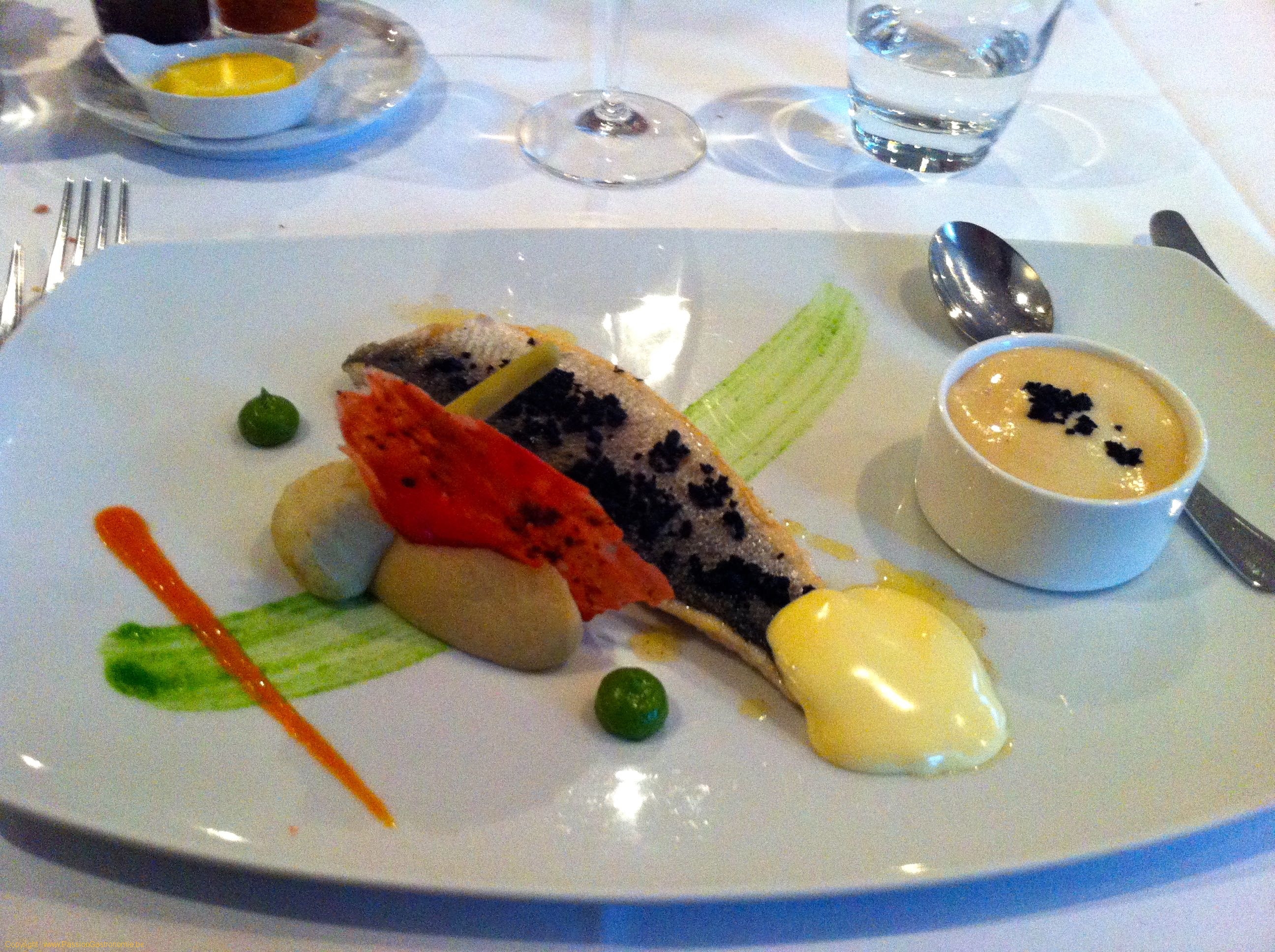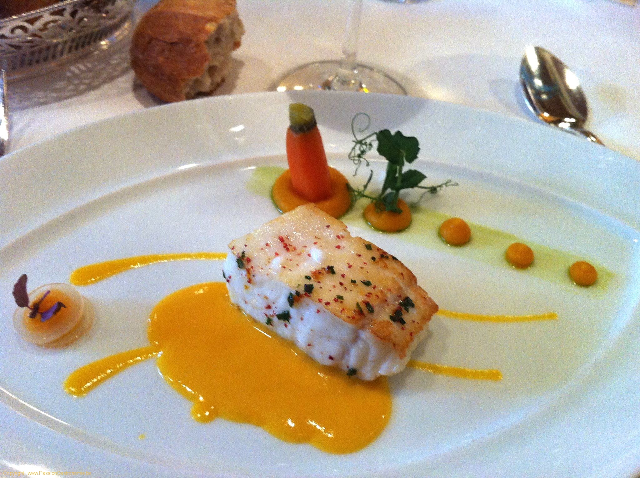 Loup de mer poêlé, mousseline de butternut, coulis de carottes au corail d'oursins @Comme Chez Soi