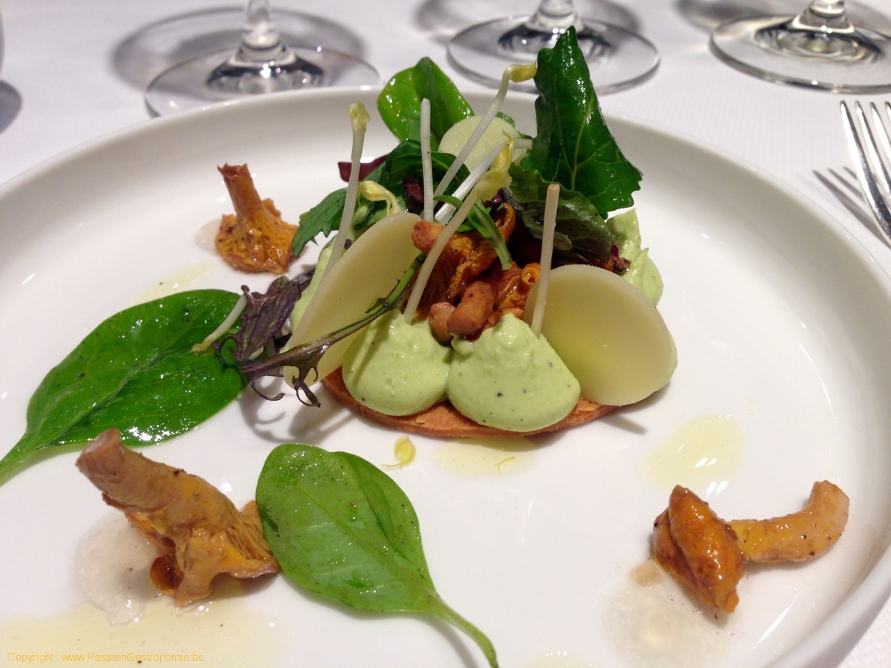 Retour de cueillette : Tarte fin de Comté, petits pois en crème, mesclun, girolles et sherry dry @D'Eugénie à Emilie