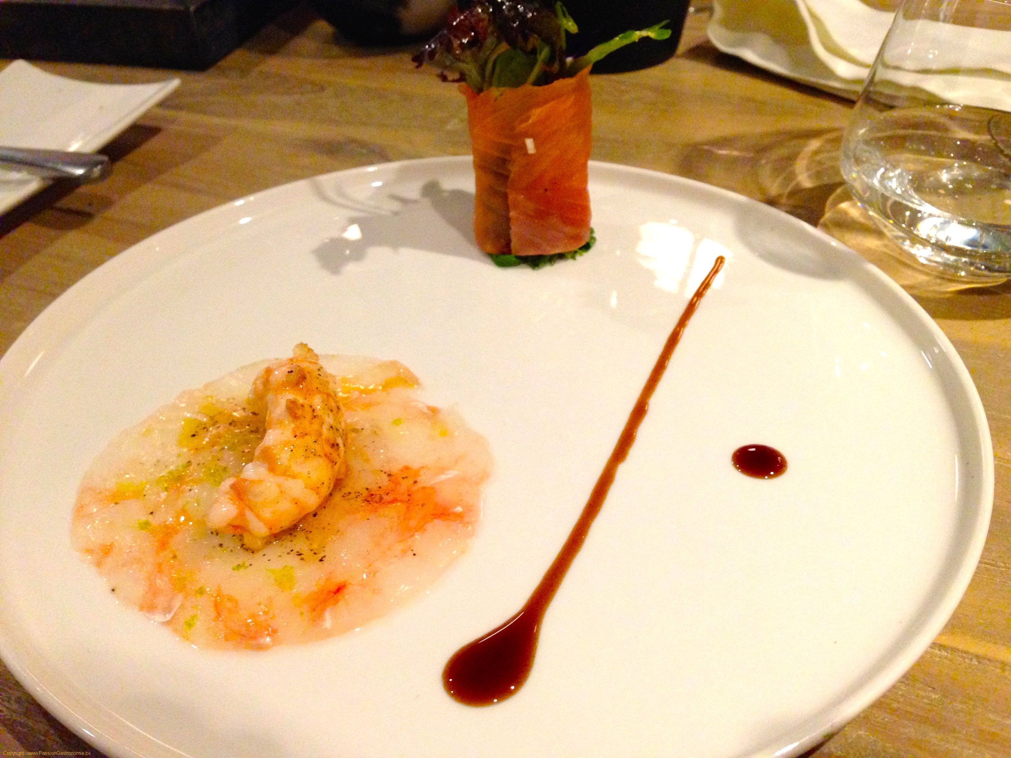 Entrée : Langoustines Bretonnes en carpaccio et snackées, mesclun et saumon fumé, réduction de vinaigre balsamique @La Cuisine d'un Gourmand