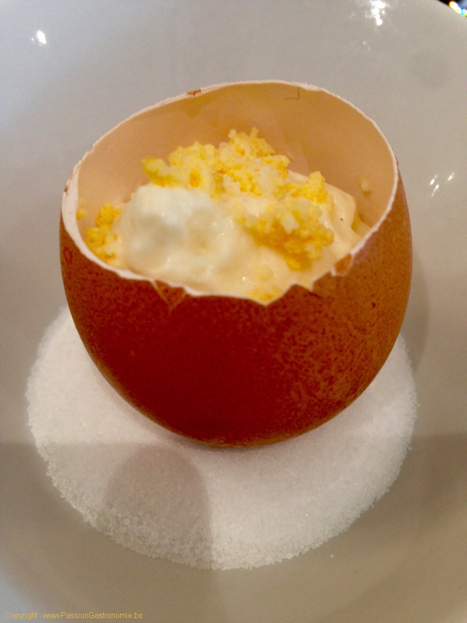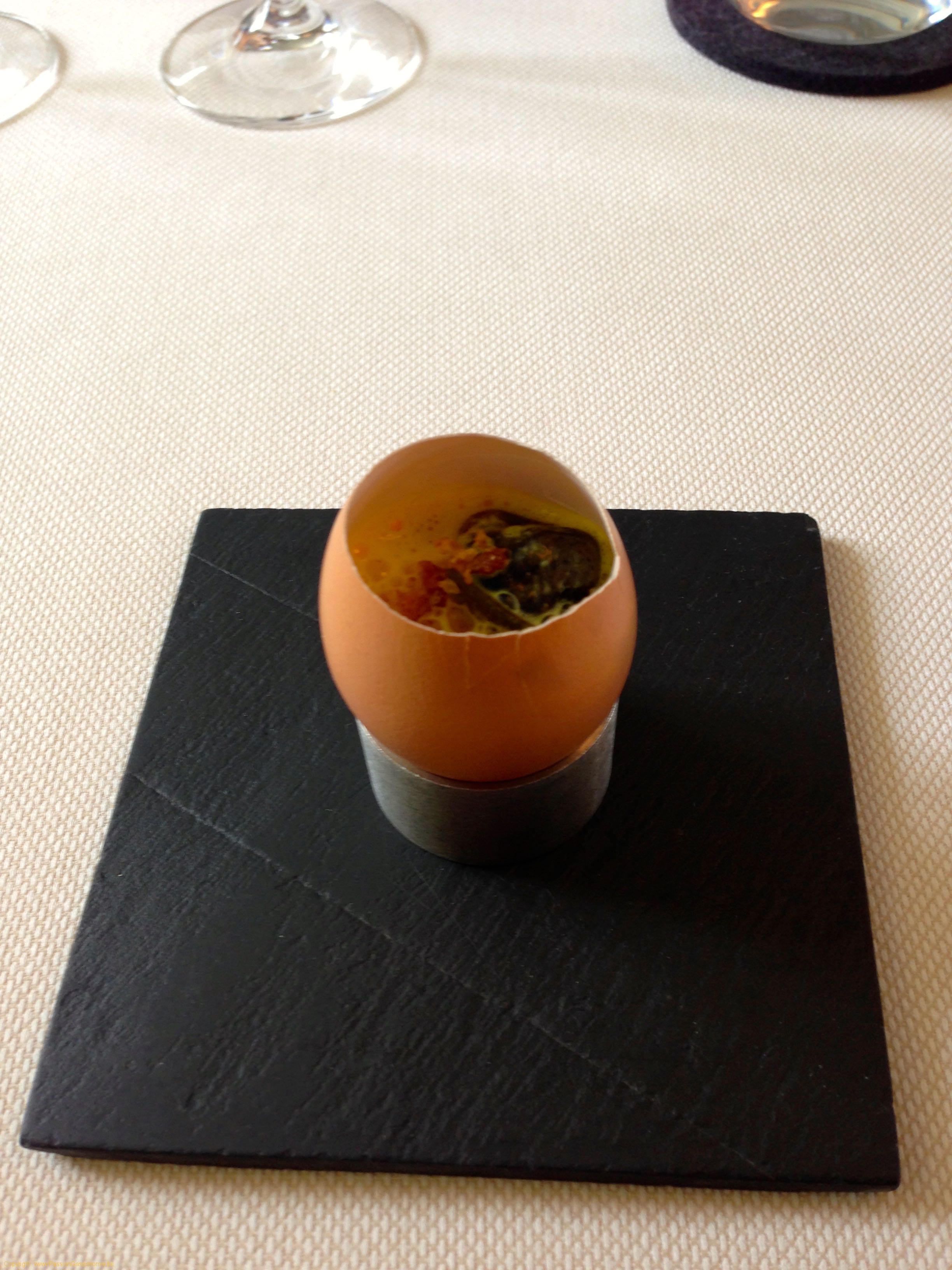 Mise en bouche: Œuf coque, émulsion de curcuma, petit gris de Namur @L'air du temps
