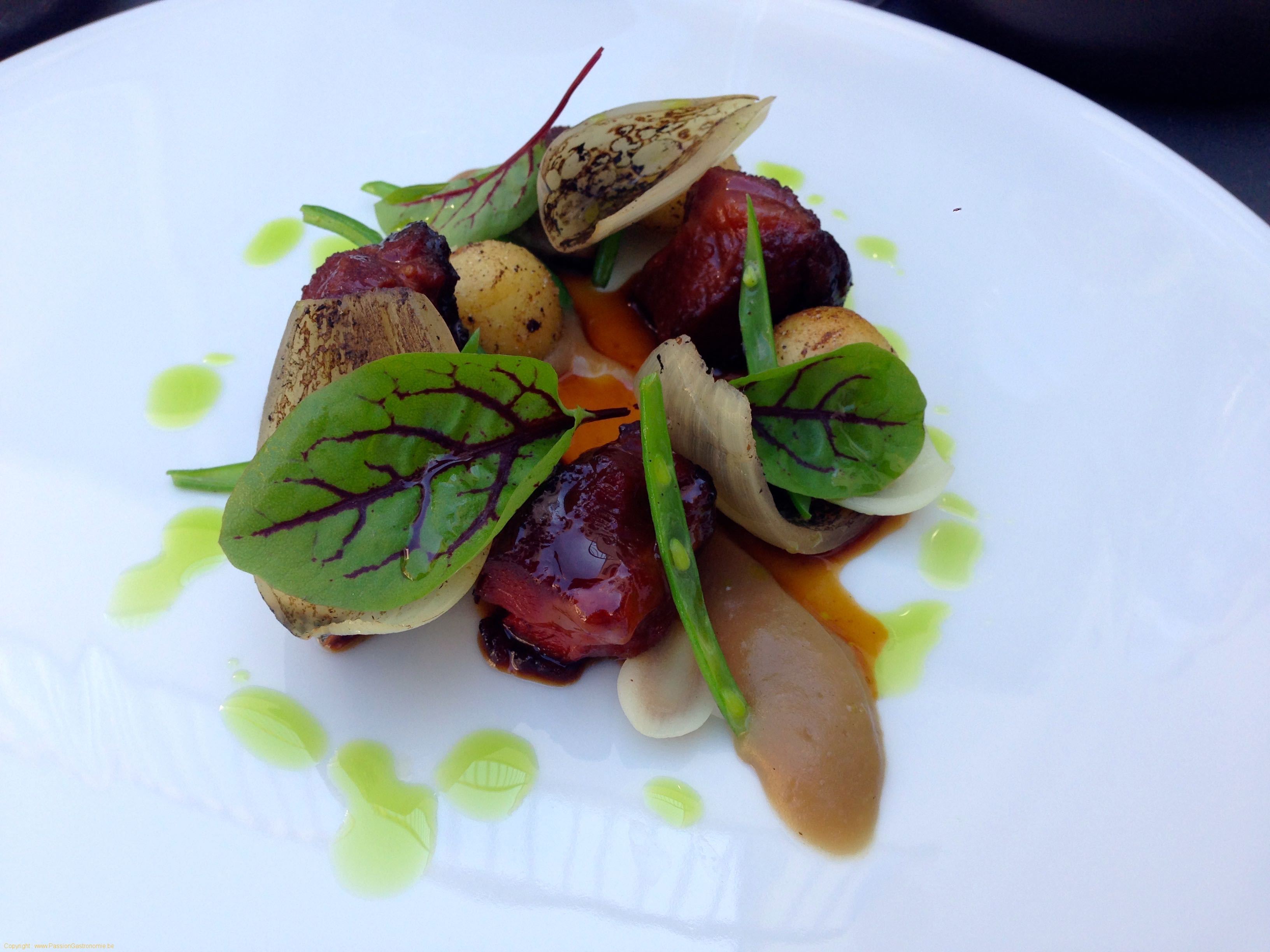 Entrée : Joue et langue de veau, échalote, oignon, jeune pomme de terre, haricot, moutarde Savora, oseille, bouillon à base de bière Vicaris @WY