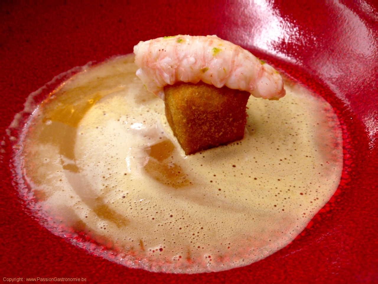 Langoustine légèrement fumée, croquette de pieds de porc confit, bisque @La Garrigue
