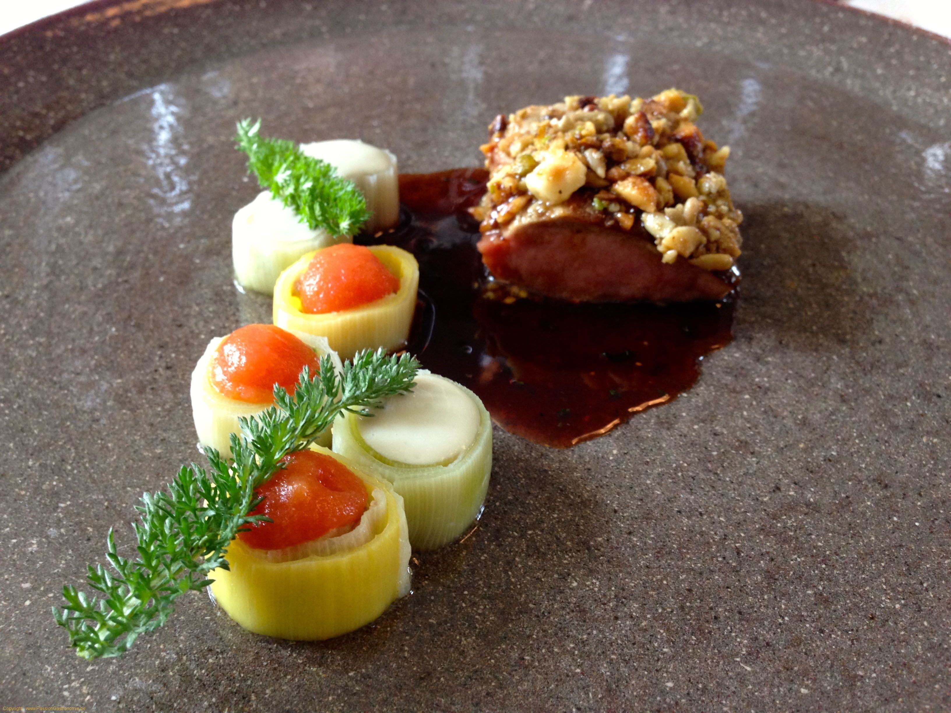 Agneau du limousin, croute aux arachides, rond de poireaux avec un curry d’agneau, note de fromage bleu et de tomates @L'air du temps