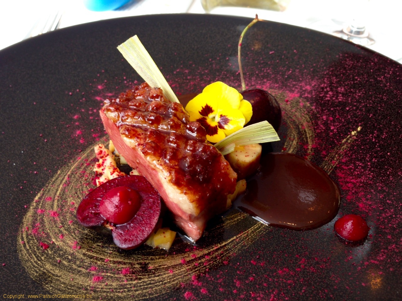 Plat : Magret de canard, foie gras, cerise, rhubarbe, pointe de vinaigre de framboise et betterave, poudre de betteraves, fleur de pensée, sauce sangria (maison) @Alexandre