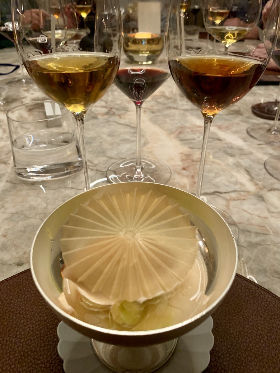 Aspic de rhubarbe, fromage blanc, sorbet au thé samba @Restaurant La Villa Emily