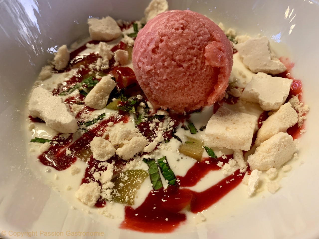 Parfait chocolat blanc et rhubarbe @Restaurant Les Gourmands