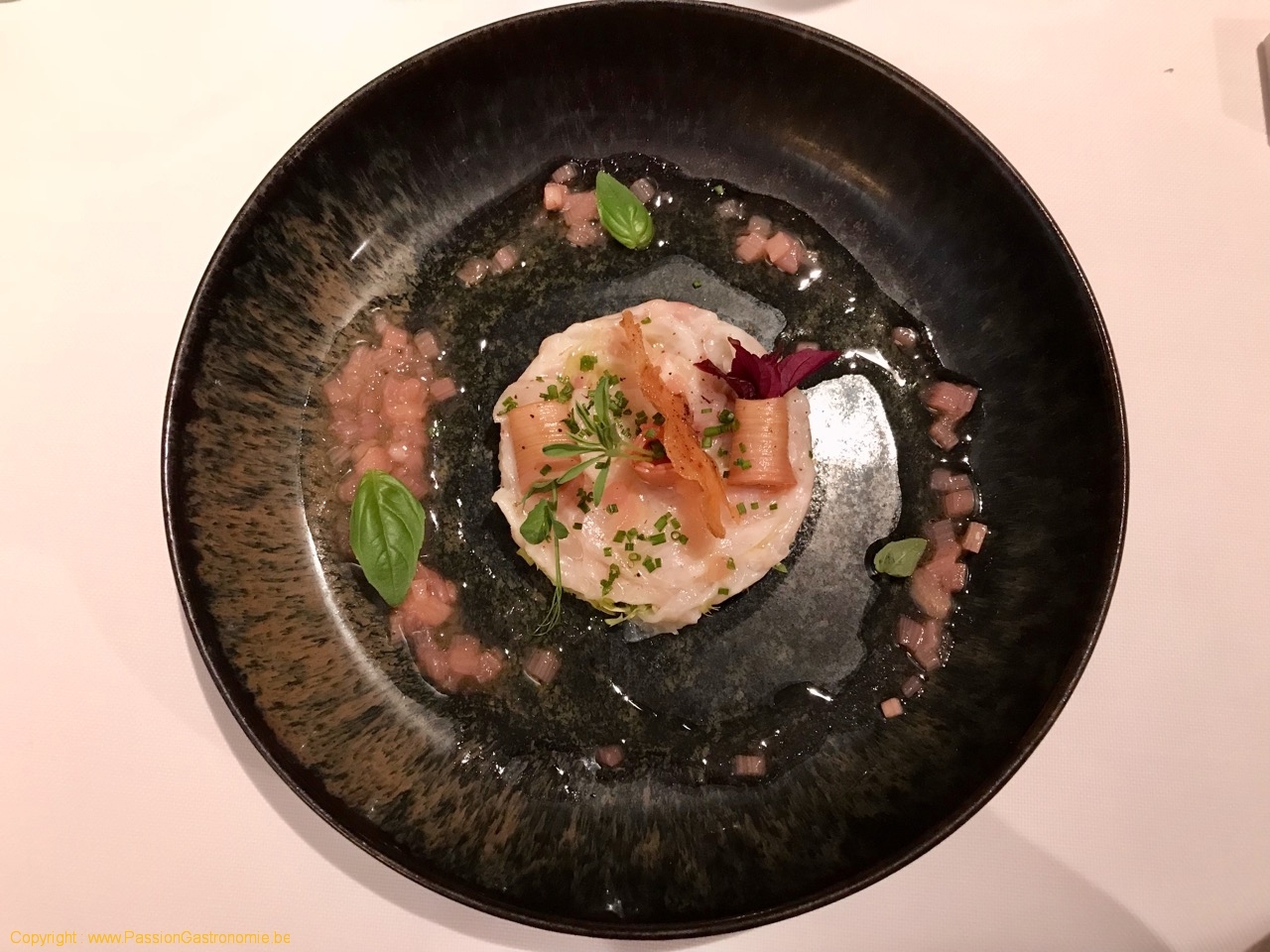 Bar « Oméga » Céviche, Vinaigrette de Rhubarbe et Noilly-Prat, Pissenlit et Basilic @Restaurant Zur Post