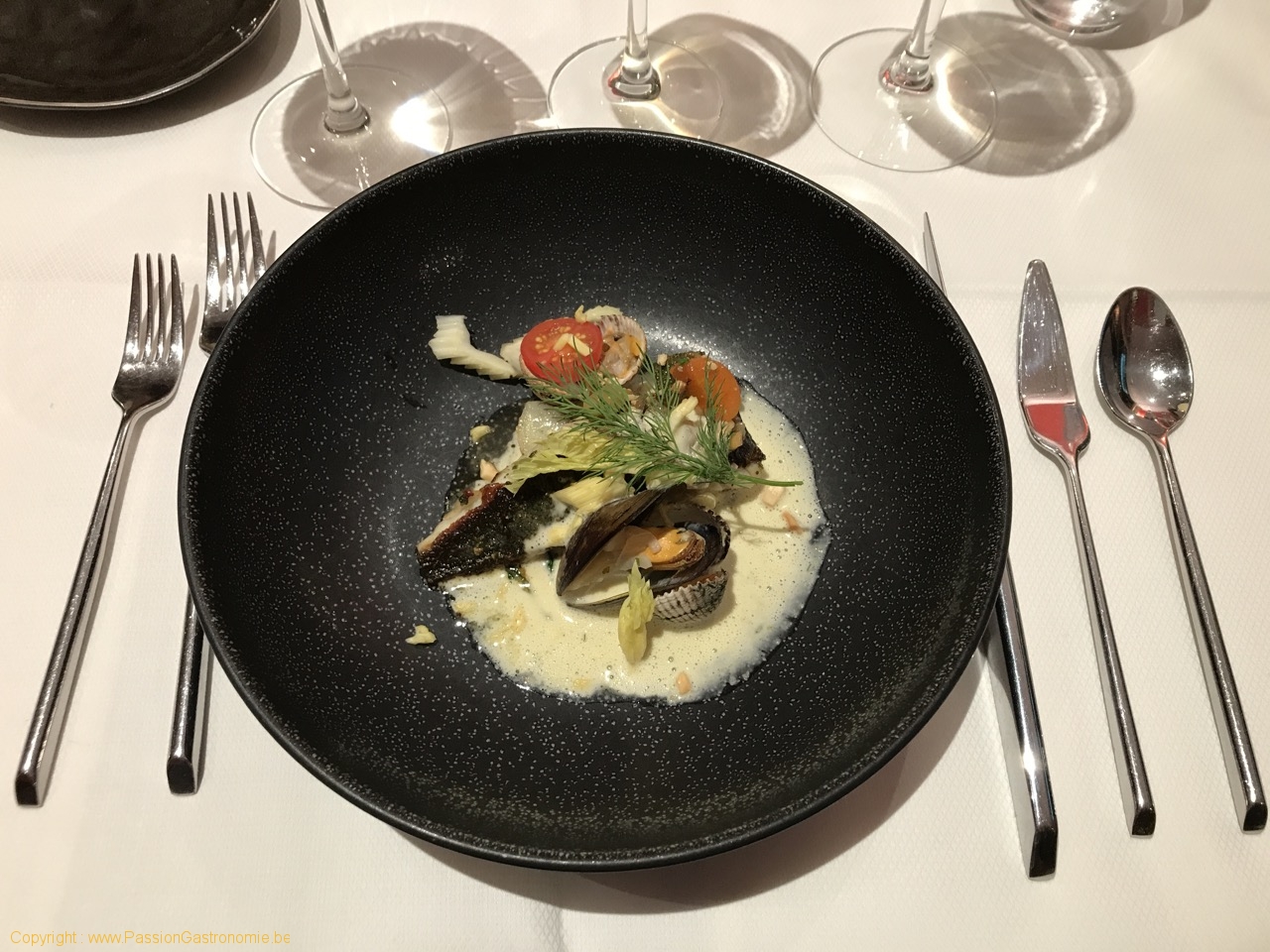 Filet de barbue rôti sur peau, coquillage, épinard, artichaut, sauce au sherry @Hostellerie Dispa