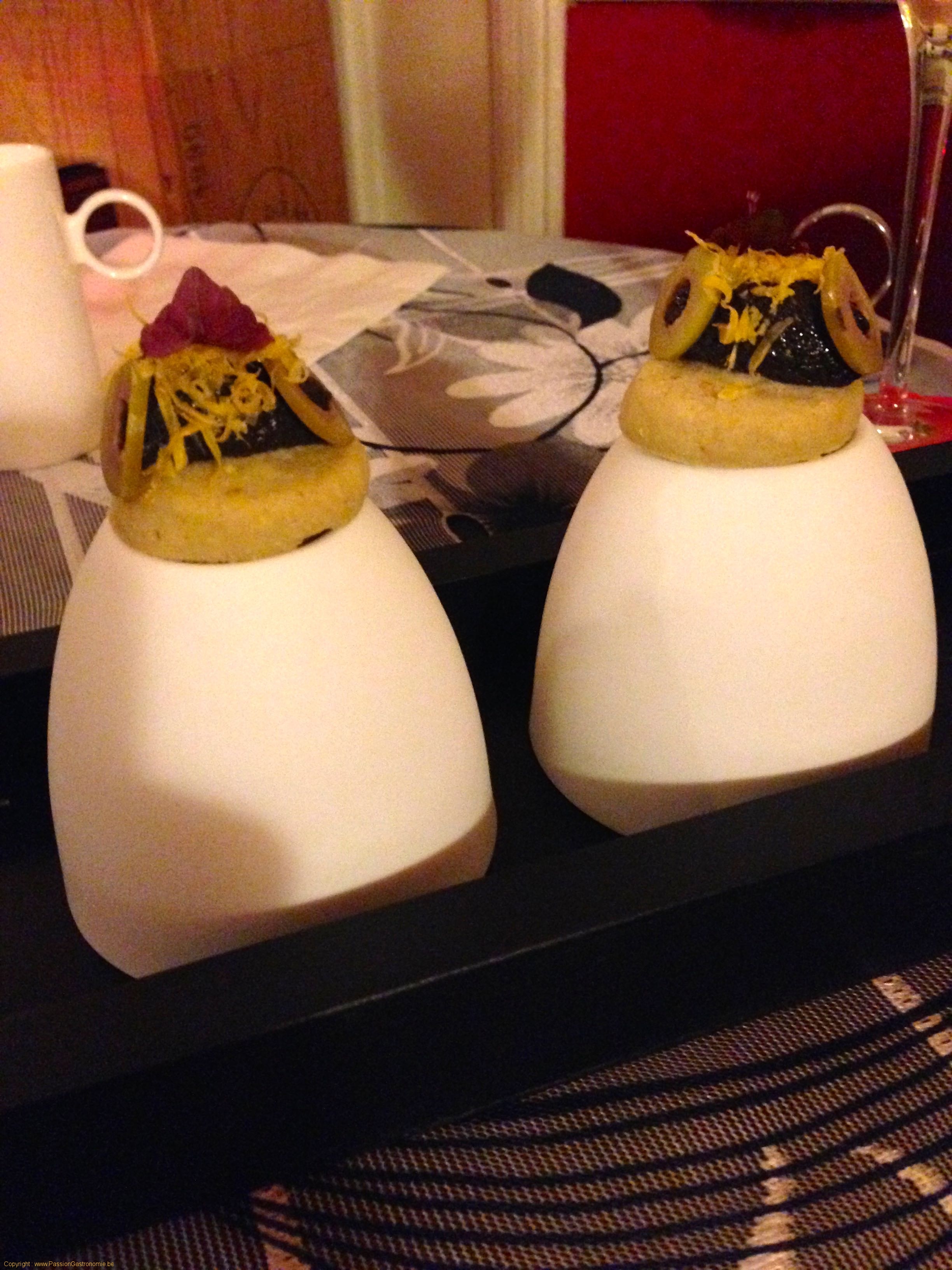 Mise en bouche : Cheddar, mimolette, tapenade d’olives et shiso pourpre @Bienvenue Chez Vous