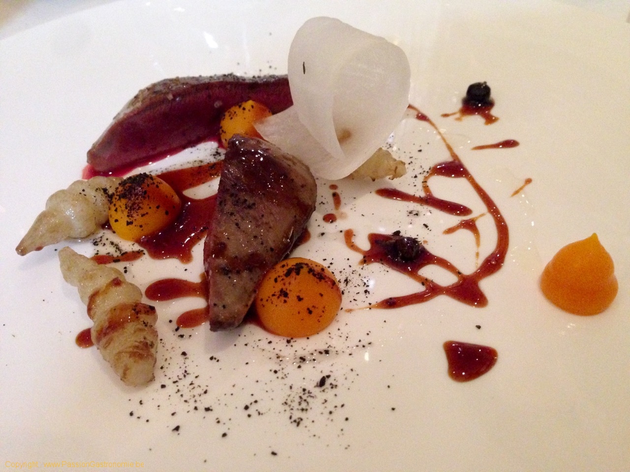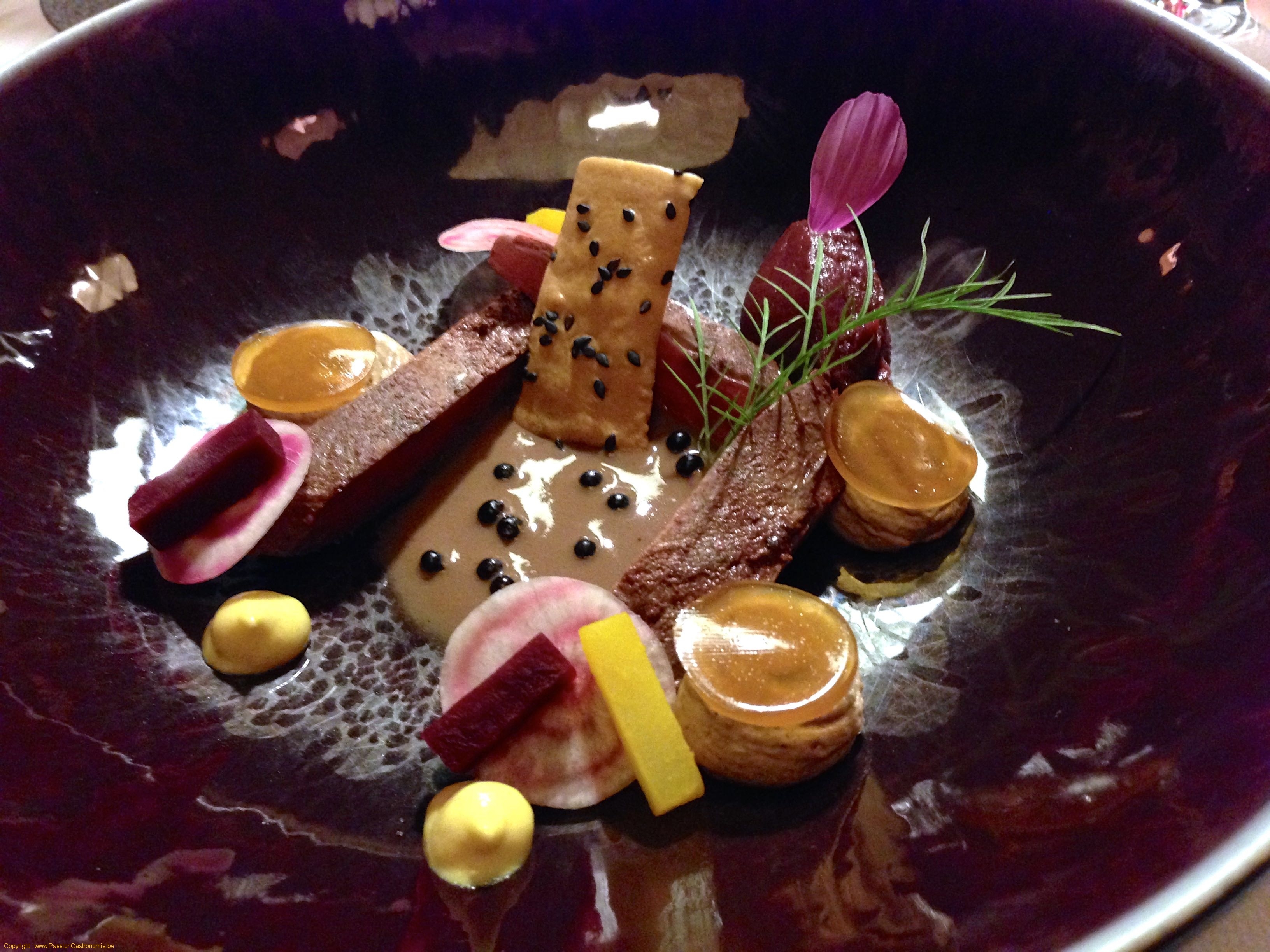 Mousse de pigeon ramier, suprême fumé, déclinaison de betteraves, vinaigrette au sureau et épices @La Table de Maxime
