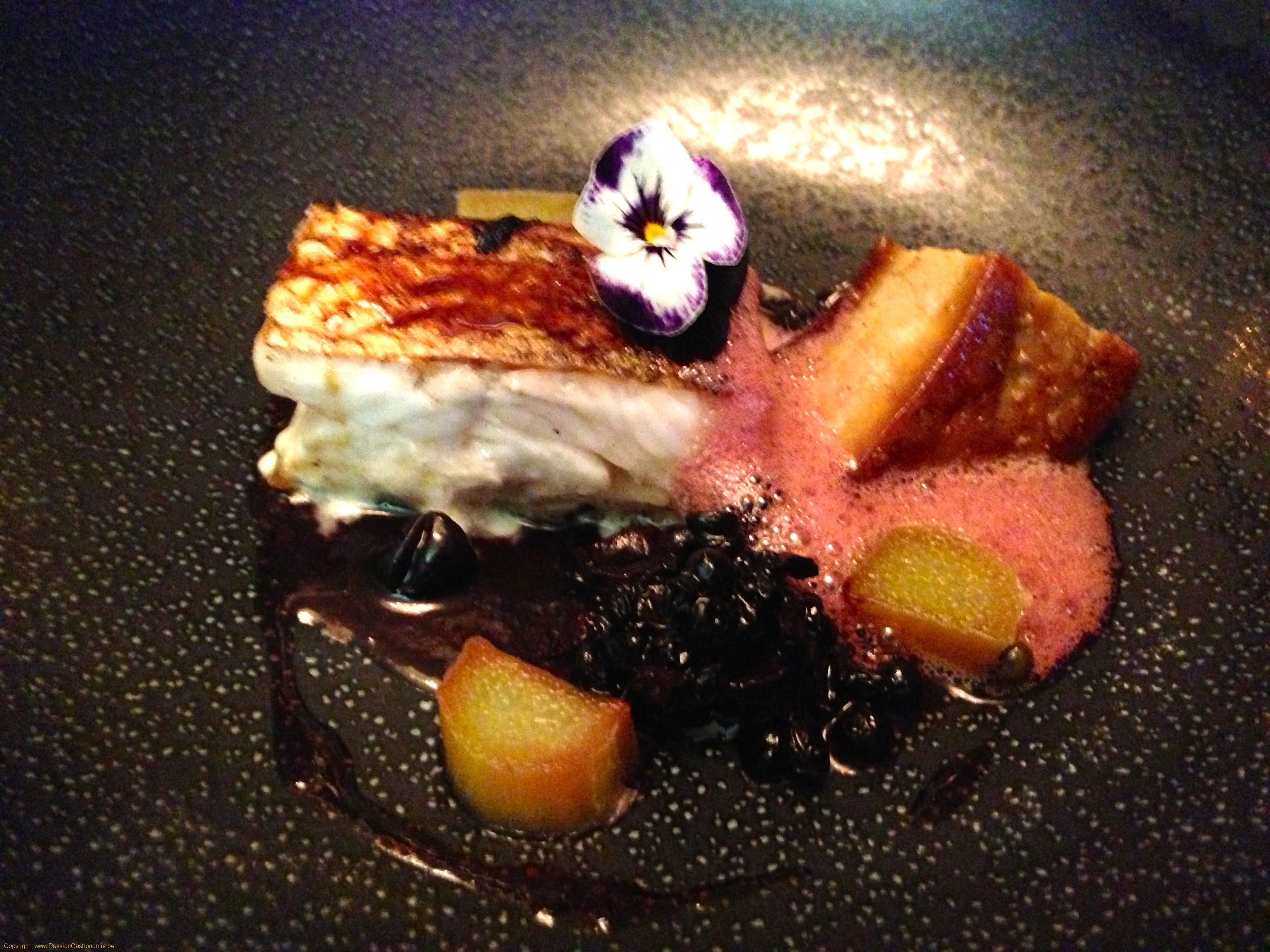 Plat : Duo de foie gras poêlé et féra du lac Léman rôti sur peau, rhubarbe confite, baies de sureau maturées et fraîches, émulsion de cassis, jus de fleurs de sureau @L'impératif