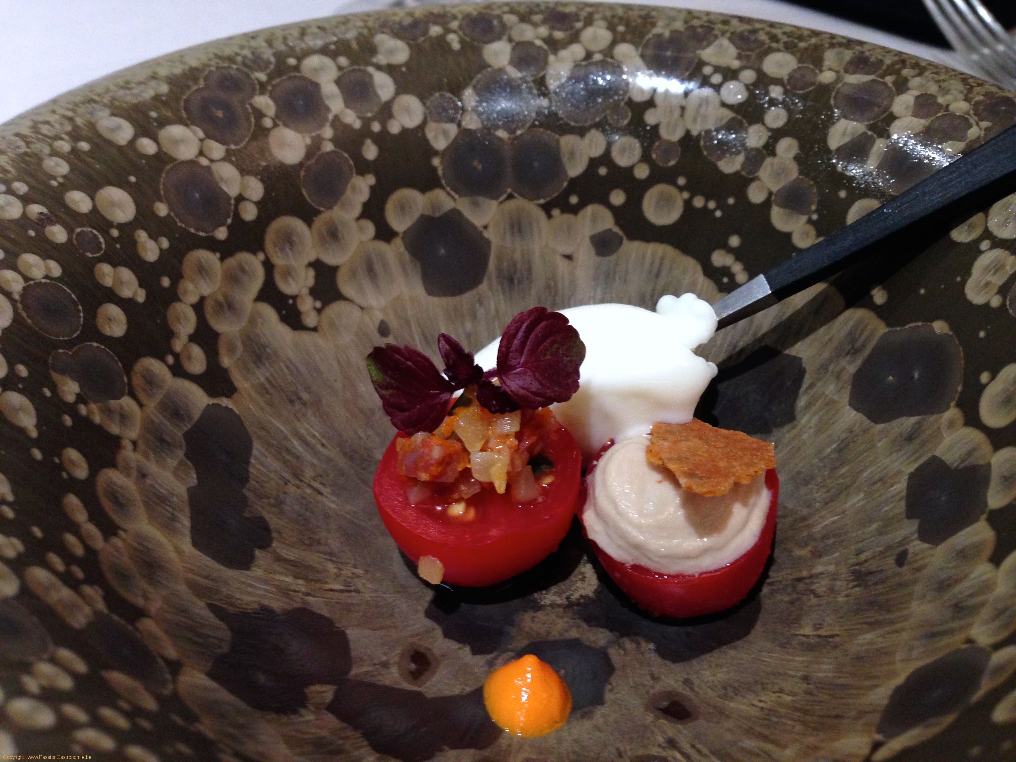 Mise en bouche : Tomate, mousse de thon, coulis de poivron, sorbet de mozzarella @Le Prieuré St Gery