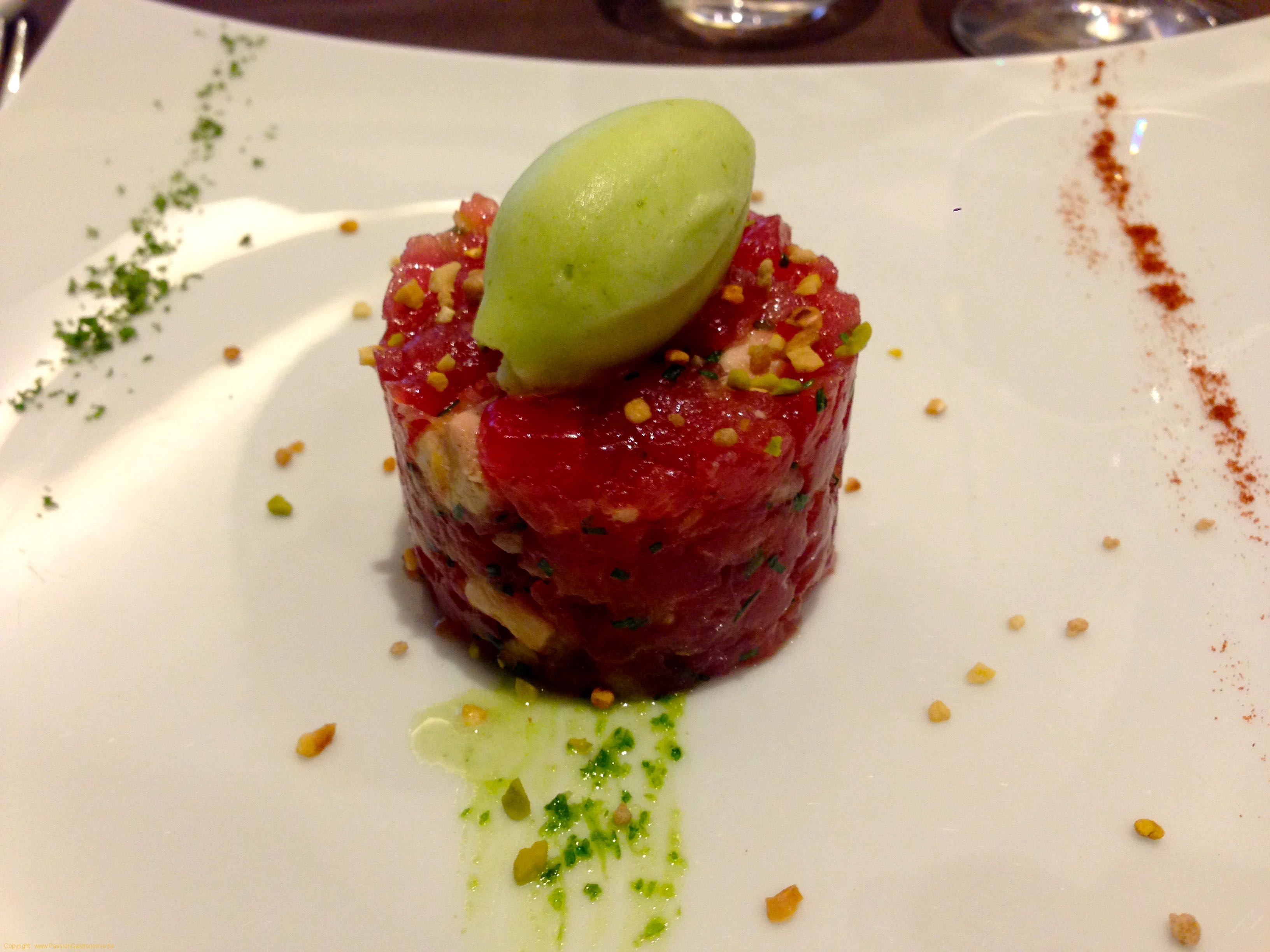 Tartare de thon rouge et foie gras, citron confit, crumble de noisettes et pistaches, sorbet de céleri vert @San Daniele