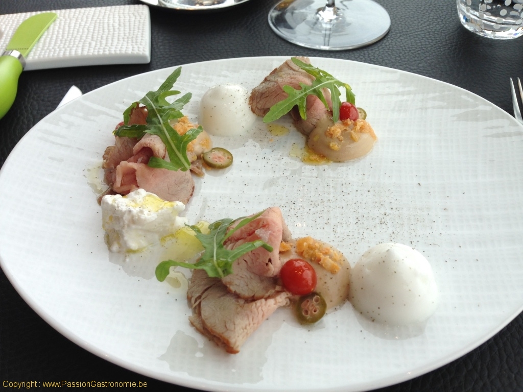 Entrée: Thon légèrement grillé, huile de chorizo, pomme de terre confite, ail noir @Le Chalet de la Forêt