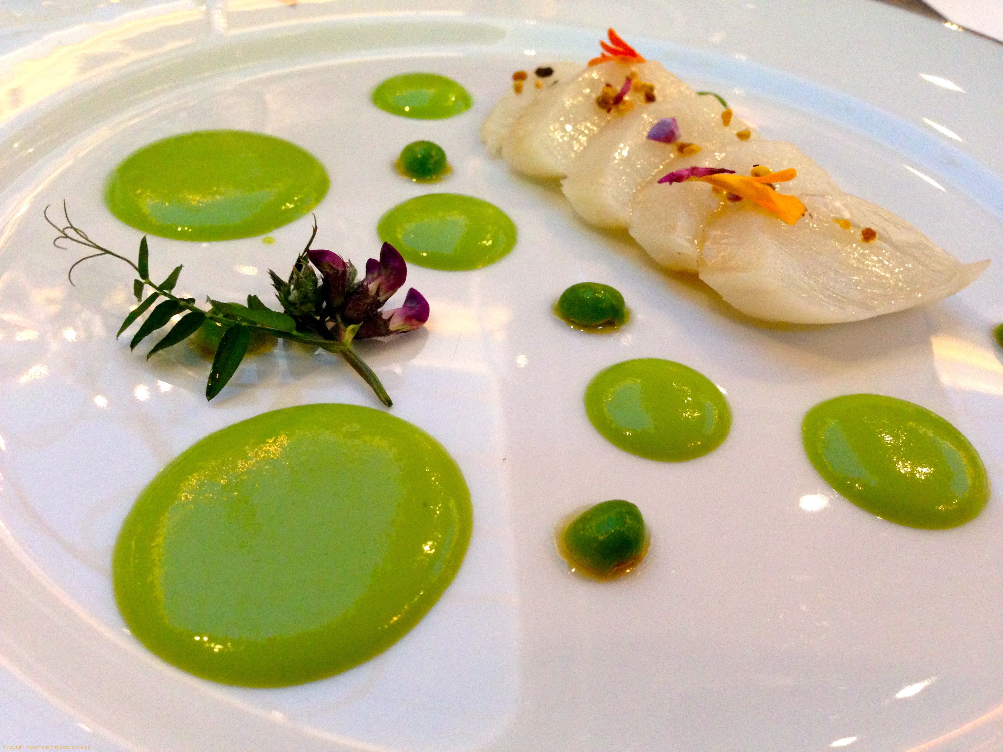 La légine australe marinée au miel et vinaigre de tilleul, velours de petits pois, fleur de petits pois, fleur de tagette Mexicaine @La Villa Lorraine