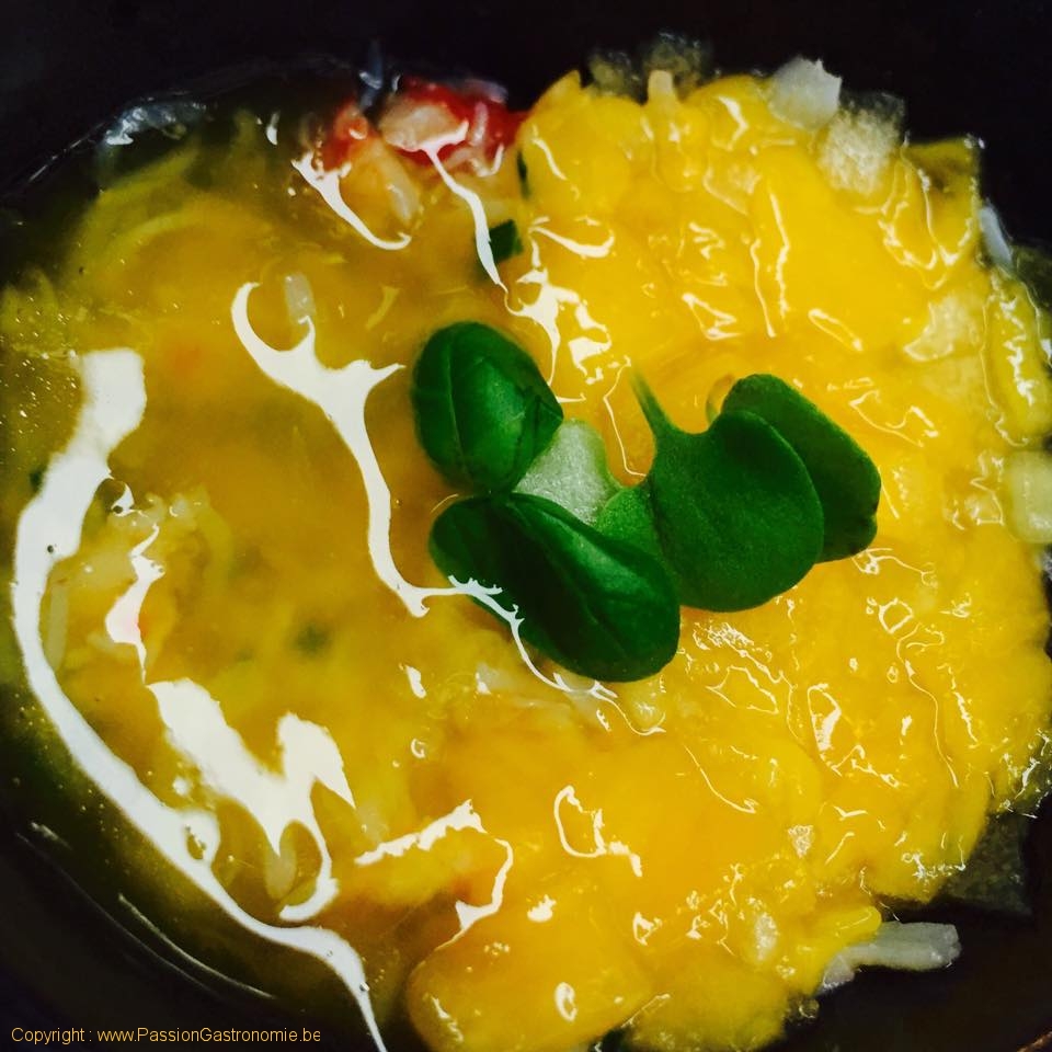 Bar de ligne, tourteau, arachides, primeurs et herbes, jus de curry et café. Une déclinaison de plats d’inspiration Indonésienne avec notamment l’utilisation de café et de Bumbu bali (mélange d’épices). @Restaurant Oud Sluis